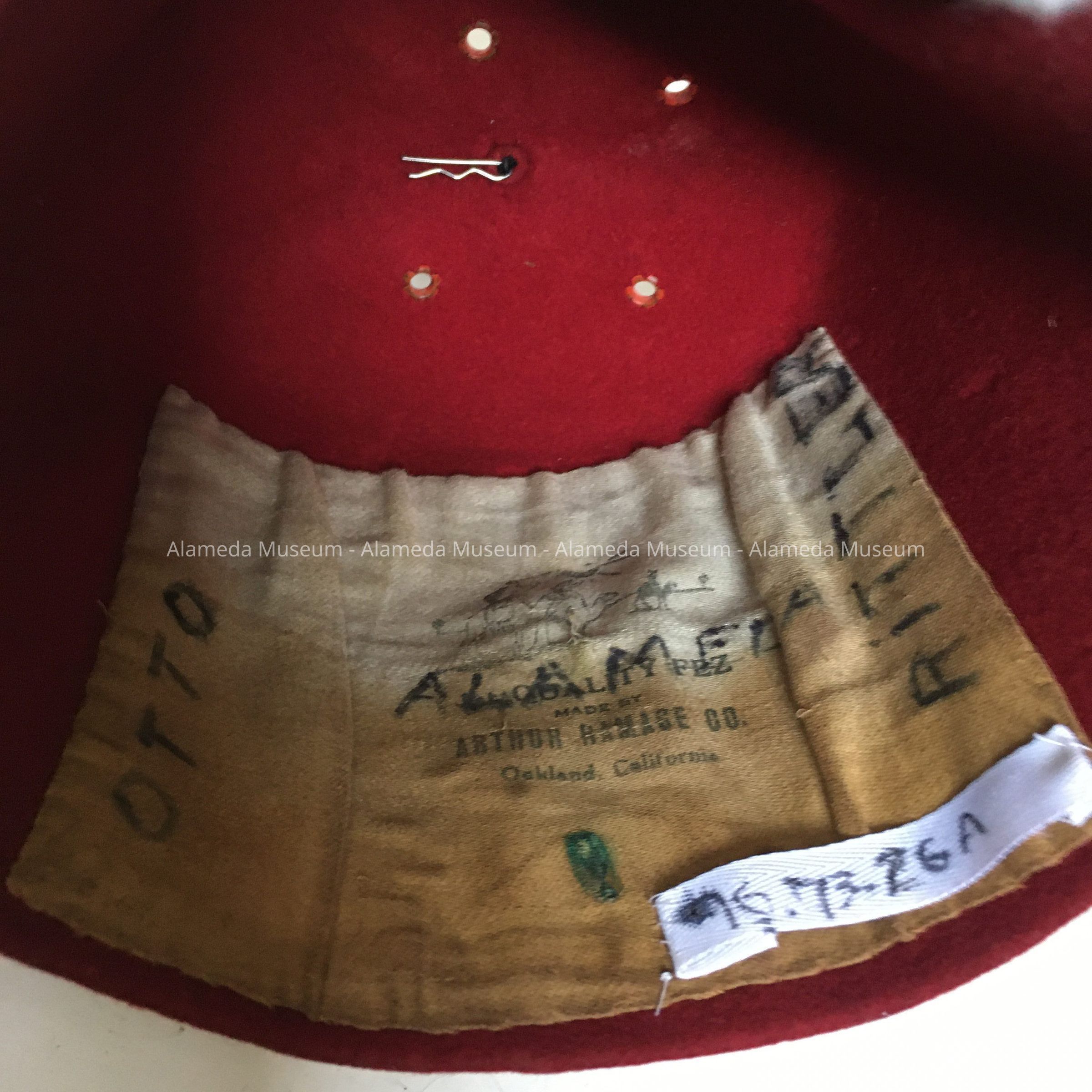 A star is placed in the middle of the crescent and below the Egyptian head. Four colored paste stones decorate the scimitar and one stone is in the center of the star (one of the four stones in the scimitar is missing). Inside the fez is a discolored white silk mfger's label that reads: Quality Fez made by Arthur Ramage Co. Oakland California. The label includes a design of three camels being ridden across the desert. The name Otto Rittler has been hand printed at the two lengthwise edges of the tag.