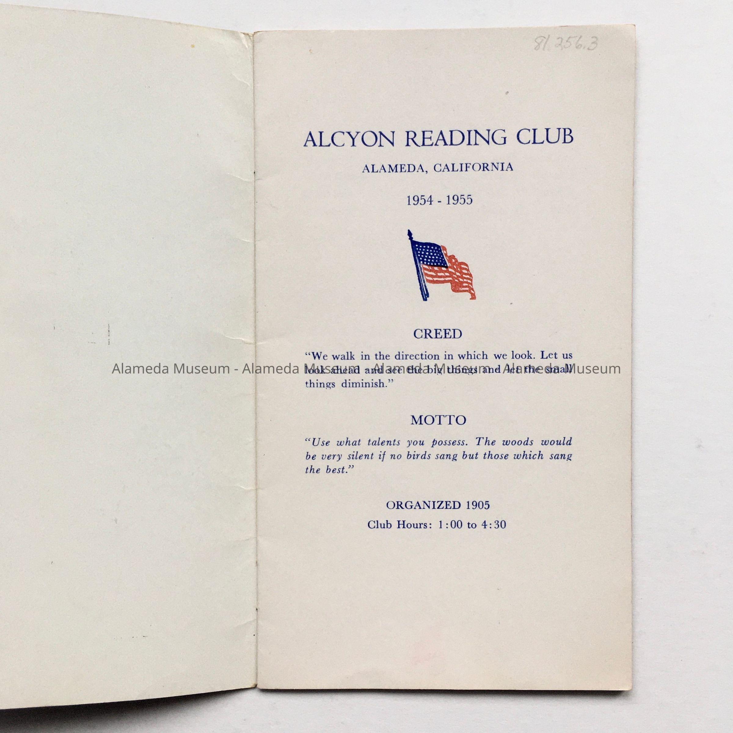 Description: Soft covered booklet, with gilt cover, with bold caption: "Alcyon Reading Club, 1905-1955."