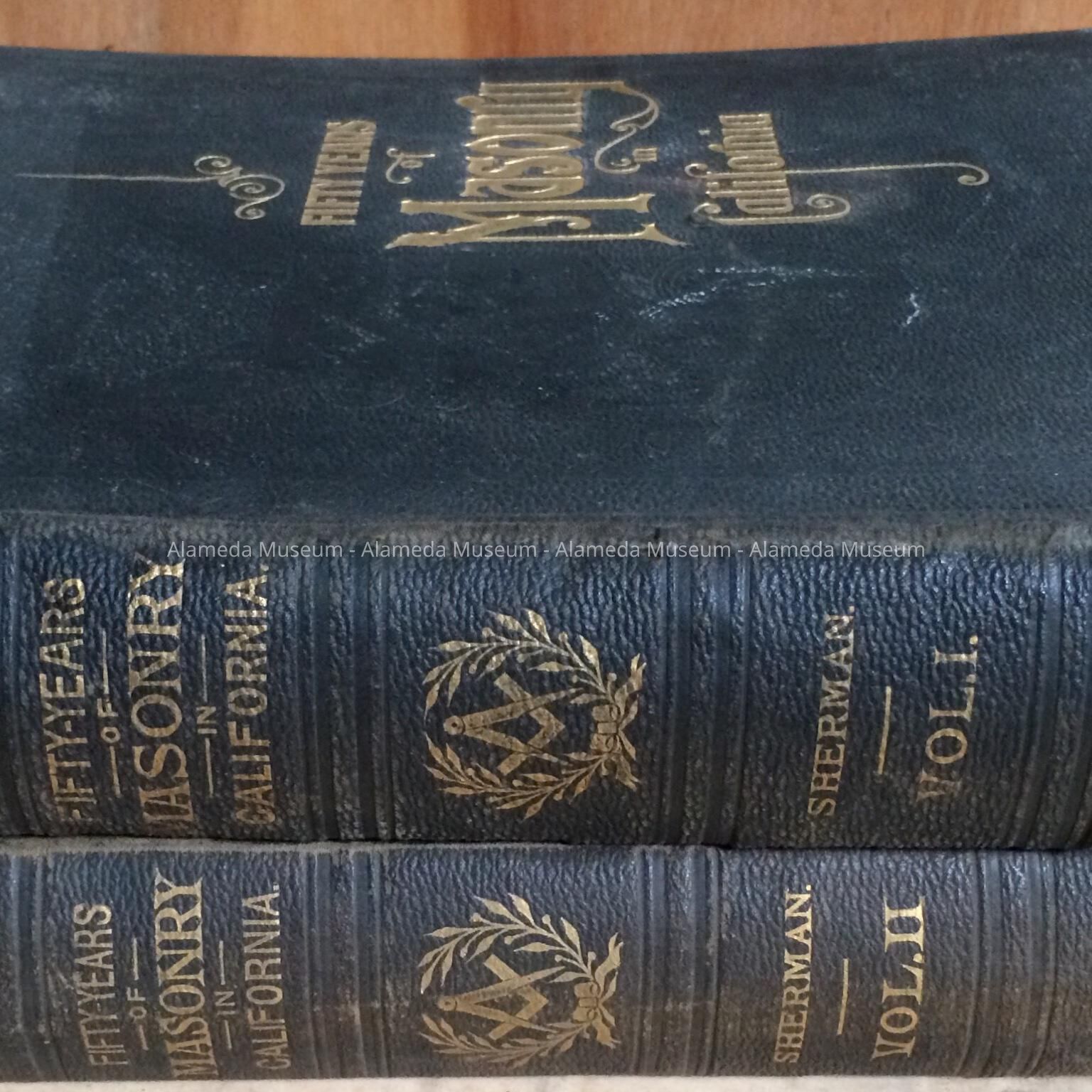 Two volumes, black buckram covers with incised printing in gold leaf "Fifty years of Masonry in California", and same title repeated on spine, plus masonic emblem, author’s name "Sherman" and volume number.