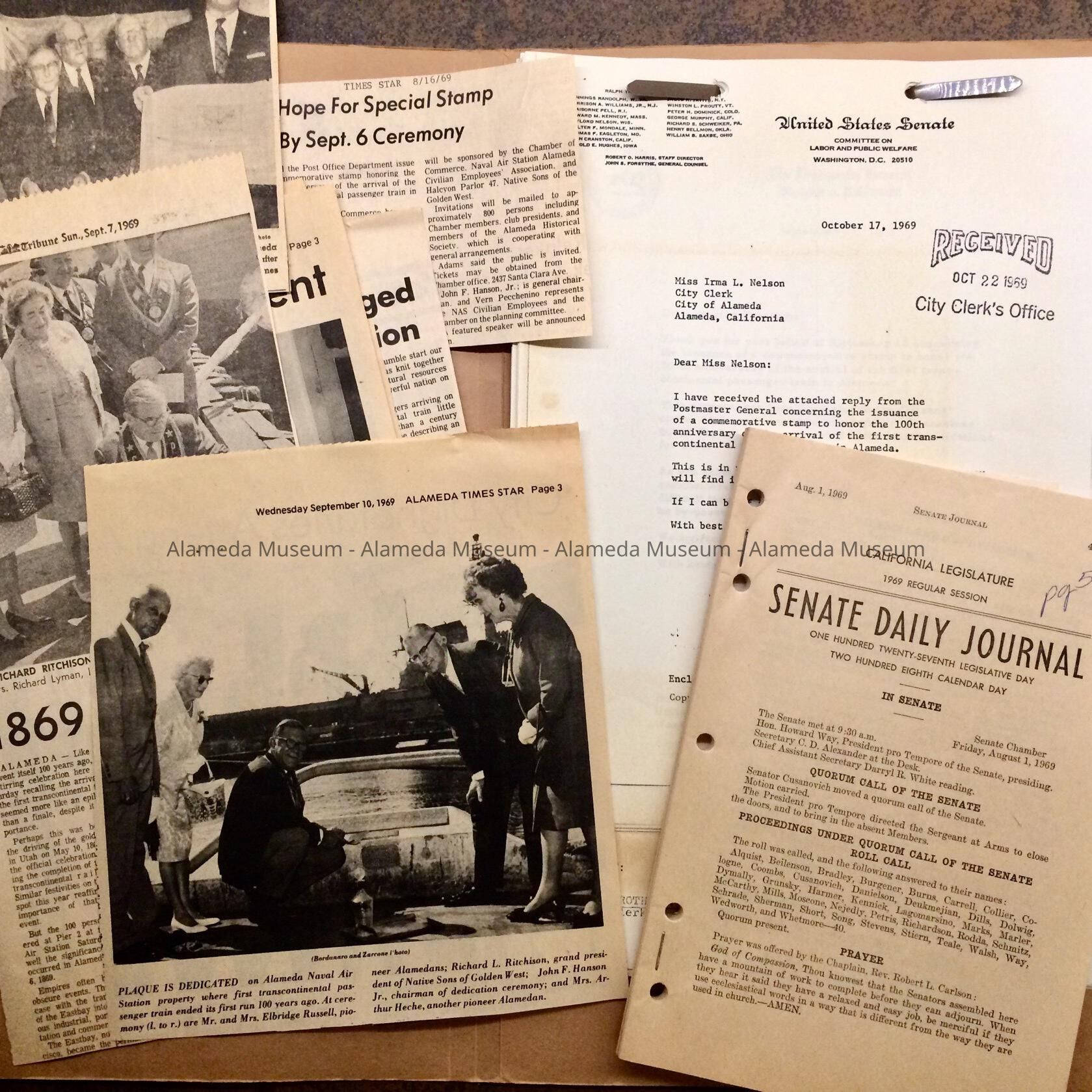 History of Object: File folder with Clippings reflecting the dedication of the plaque at the Naval Air Base. Shows various attempts to gain support for the stamp. Includes Senate Daily Journal, which on page 5031 shows the decision by the U.S. senate to suggest the Postmaster General to issue a stamp, which the Postmaster forwarded to the Citizens’ Stamp Advisory Committee, which is where it stuck.