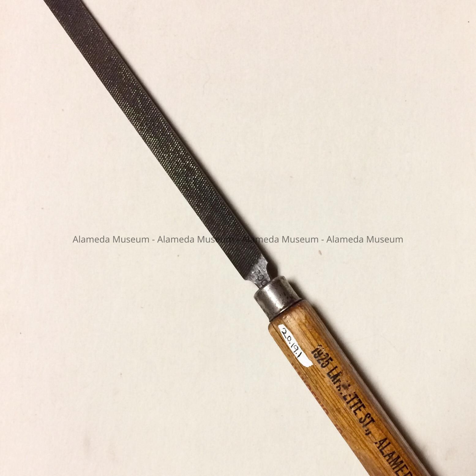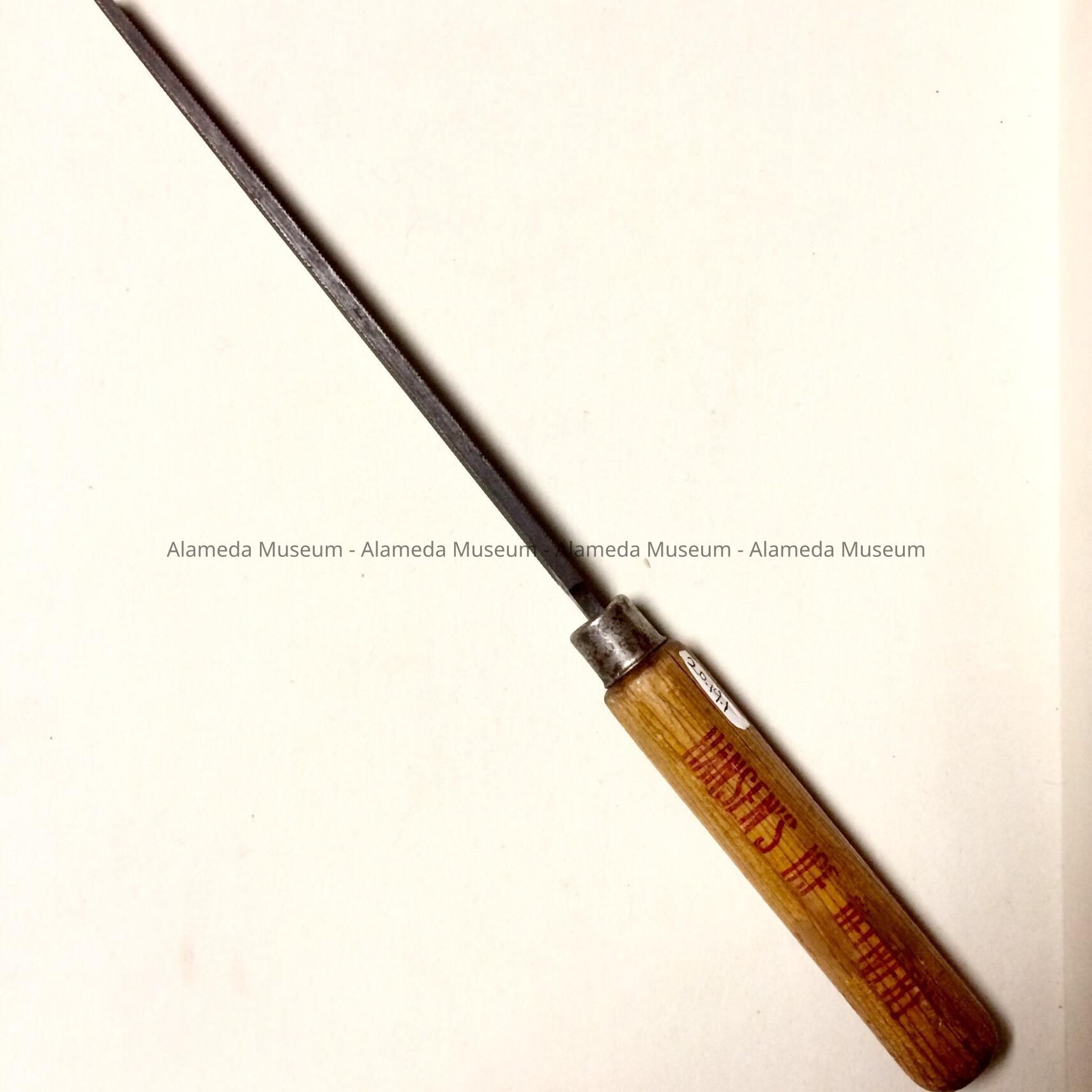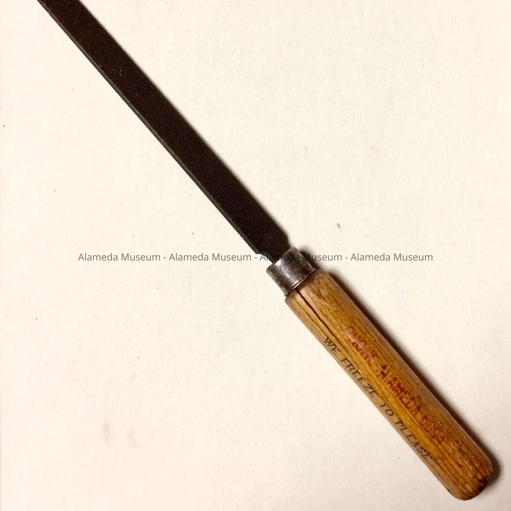 Description: A file with a wooden handle that appears to be varnished oak. The handle is labeled with a transfer print in a red color, “We freeze to please. Hansen's Ice Delivery, Alameda, Phone (the number is indistinct) J925 Lafayette St.”