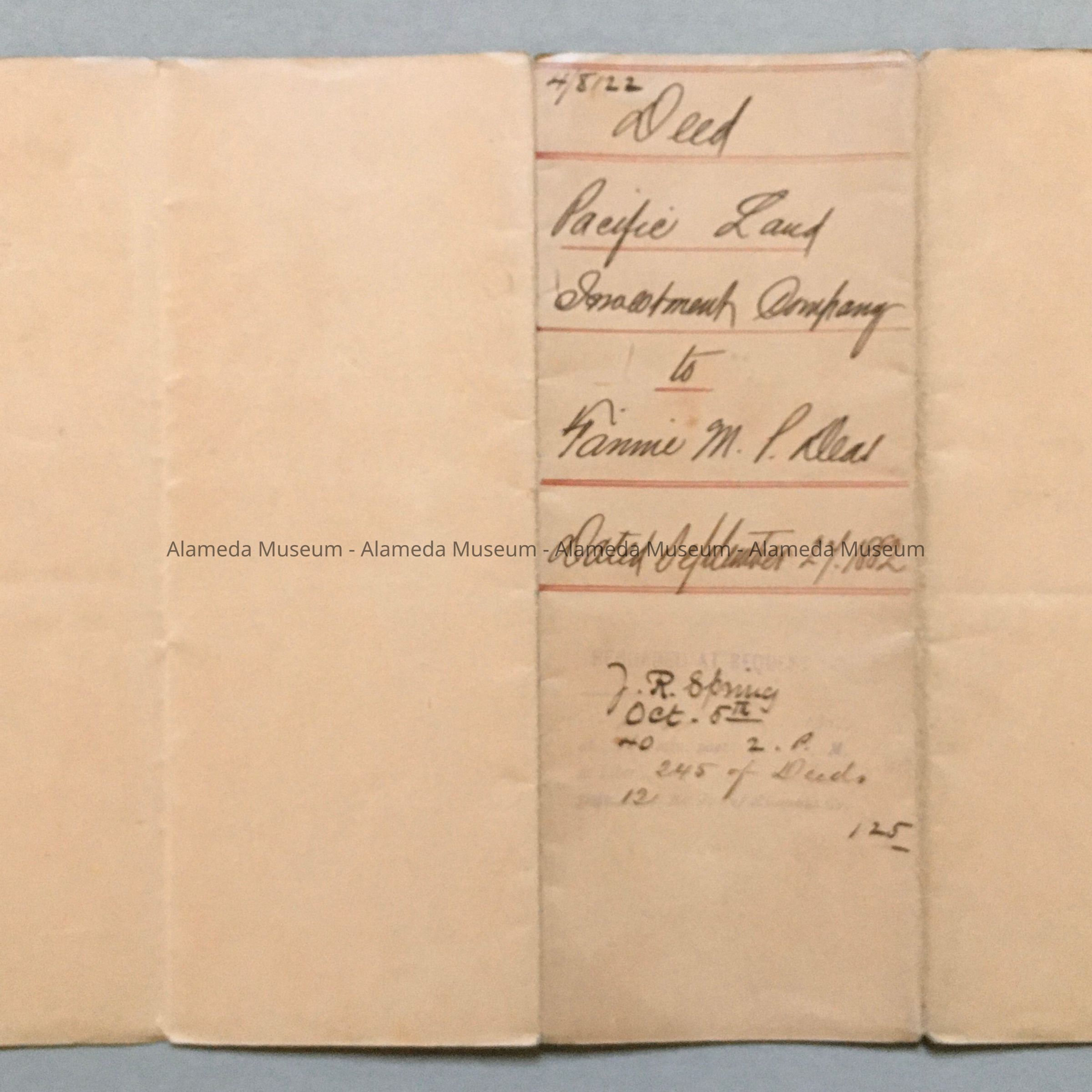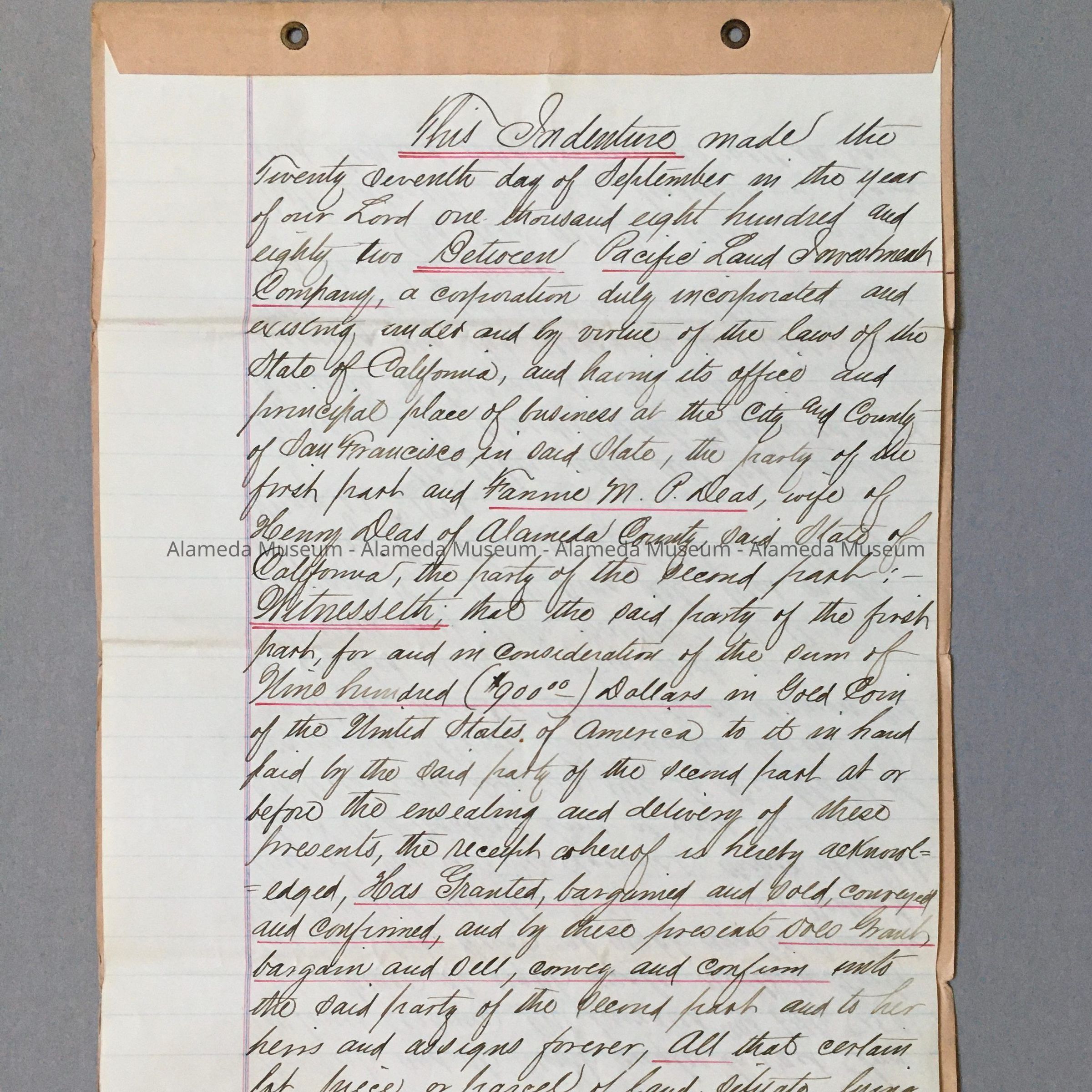 HISTORY OF OBJECT: FINAL PAYMENT FOR LAND (1729 SAN ANTONIO) TO THE PAC. LAND INVESTMENT COMPANY, AND SIGNED BY THE PRESIDENT OF THE COMPANY, ALFRED E. DAVIS, TO FANNIE M. P. DEAS. DATED SEPT 27, 1882