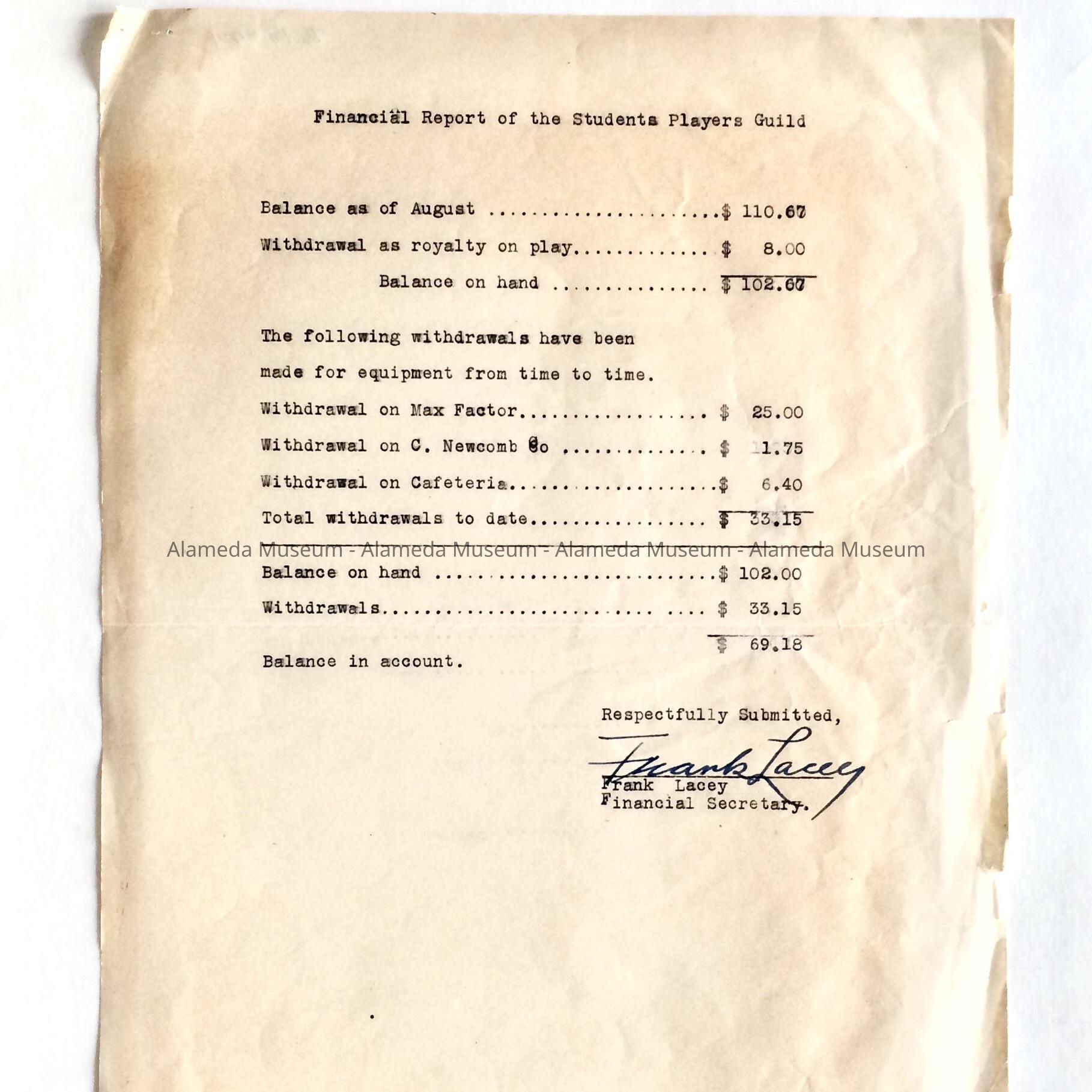 HISTORY OF OBJECT: FINANCIAL REPORT OF THE STUDENTS PLAYERS GUILD, ALAMEDA HIGH SCHOOL.