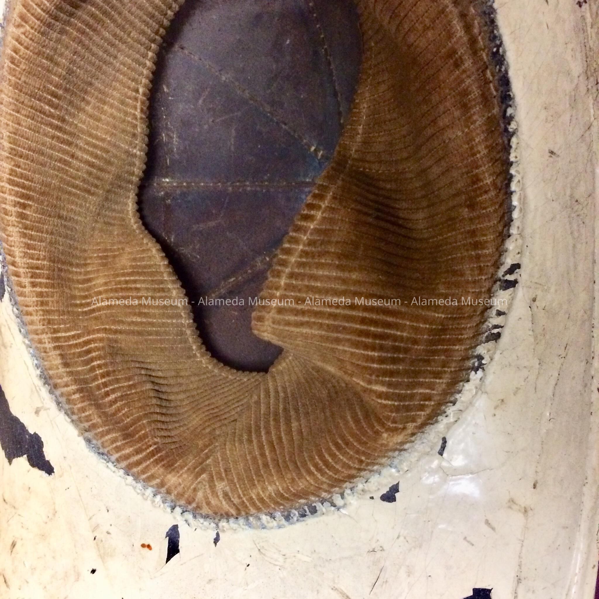 Description: A hard leather helmet, painted white (to denote that it's the fire chief's helmet.) The front of the helmet has a shield surmounted by a brass eagle's head. The interior has a brown corduroy sweat band. Size: Helmet brim 14 "X 11". 9" high.