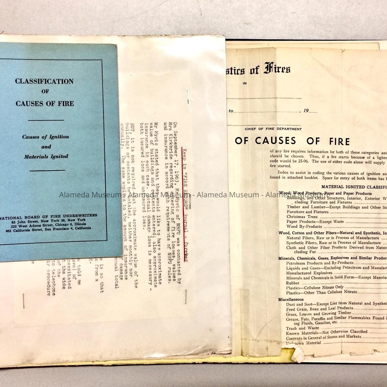 HARD-BOUND LEDGER BOOK, WITH COVER OF BLACK-COLORED IMITATION LEATHER. INSCRIBED CAPTION READS, "FIRE RECORD," IN GOLD COLORED TYPE. COVER HAS BEEN REINFORCED BY THE ADDITION OF BLUE-COLORED TAPE. LOOSE-LEAF BINDER TYPE LEDGER. ENTRIES ARE HANDWRITTEN ON PAGES WITH PRINTED CAPTIONS.