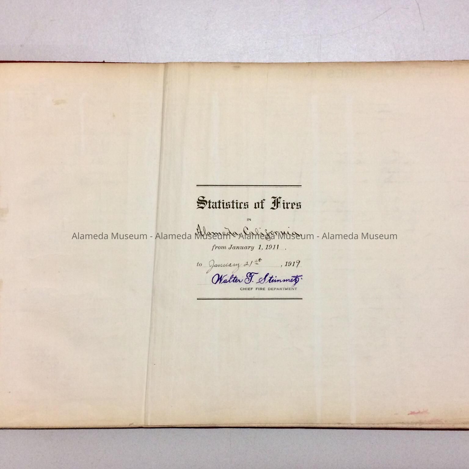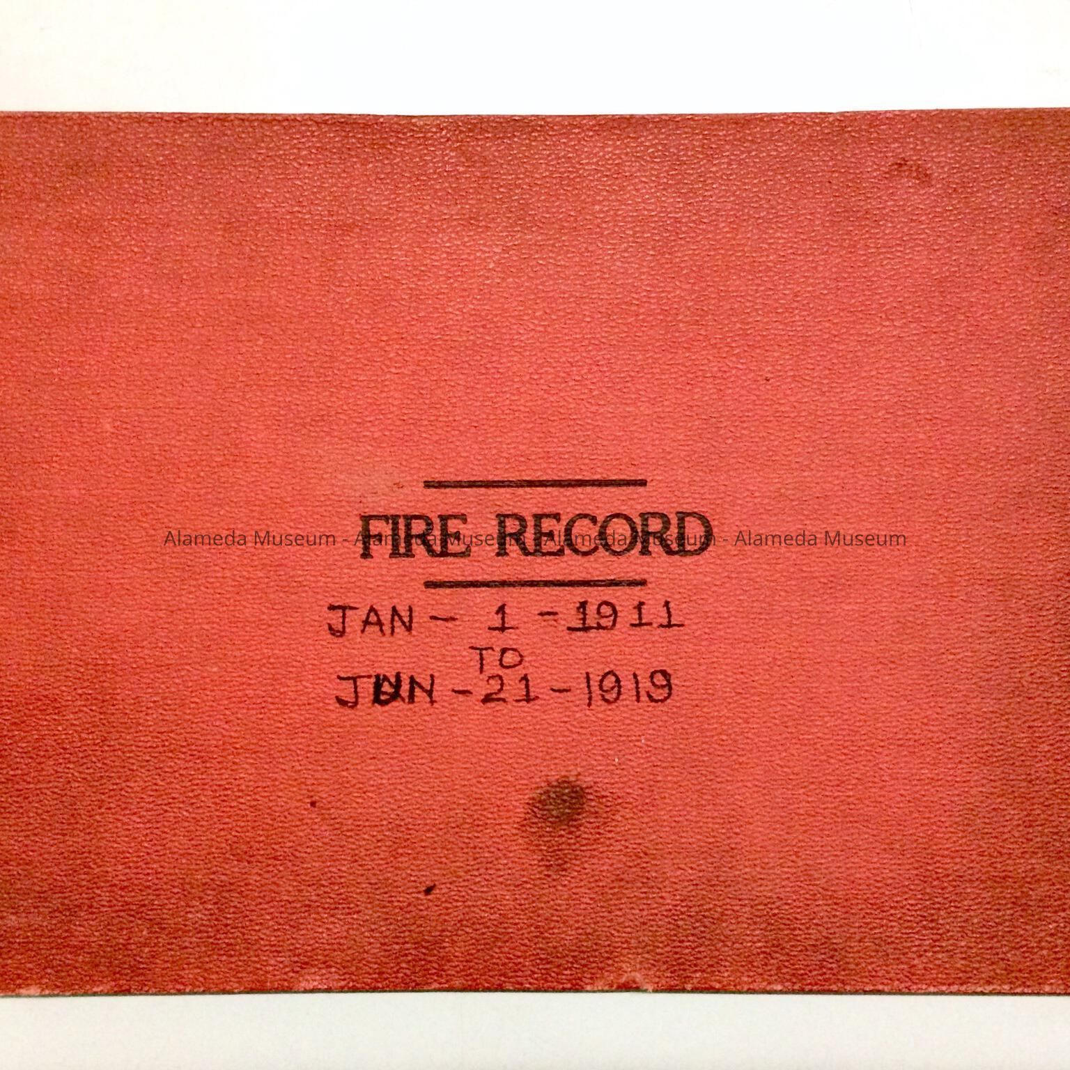 LEDGER CONTAINING STATISTICS OF FIRES IN THE CITY OF ALAMEDA FROM JANUARY 1, 1911 TO JUNE 21, 1919. THE RECORDS WERE COMPILED DURING THE OFFICE OF WALTER T STEINMETZ, FIRE CHIEF.