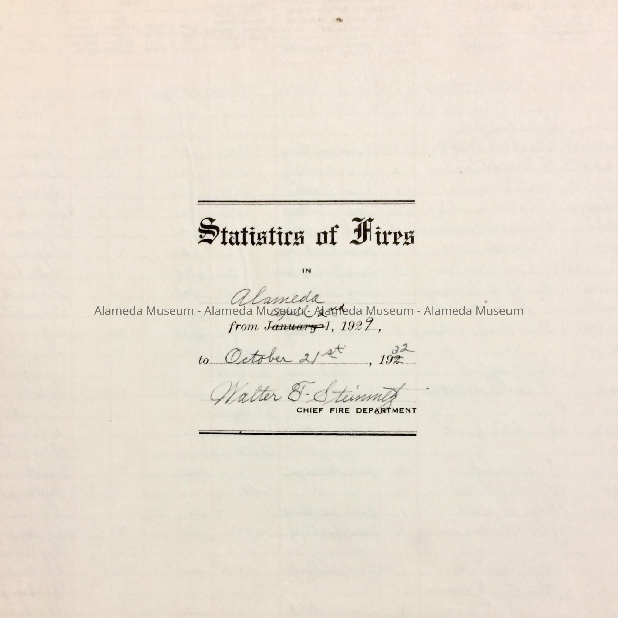 LEDGER CONTAINING STATISTICS OF FIRES IN THE CITY OF ALAMEDA DURING THE PERIOD APRIL 2, 1929 TO OCTOBER 21, 1932. RECORDS WERE COMPILED DURING THE TENURE OF WALTER T STEINMETZ, FIRE CHIEF.