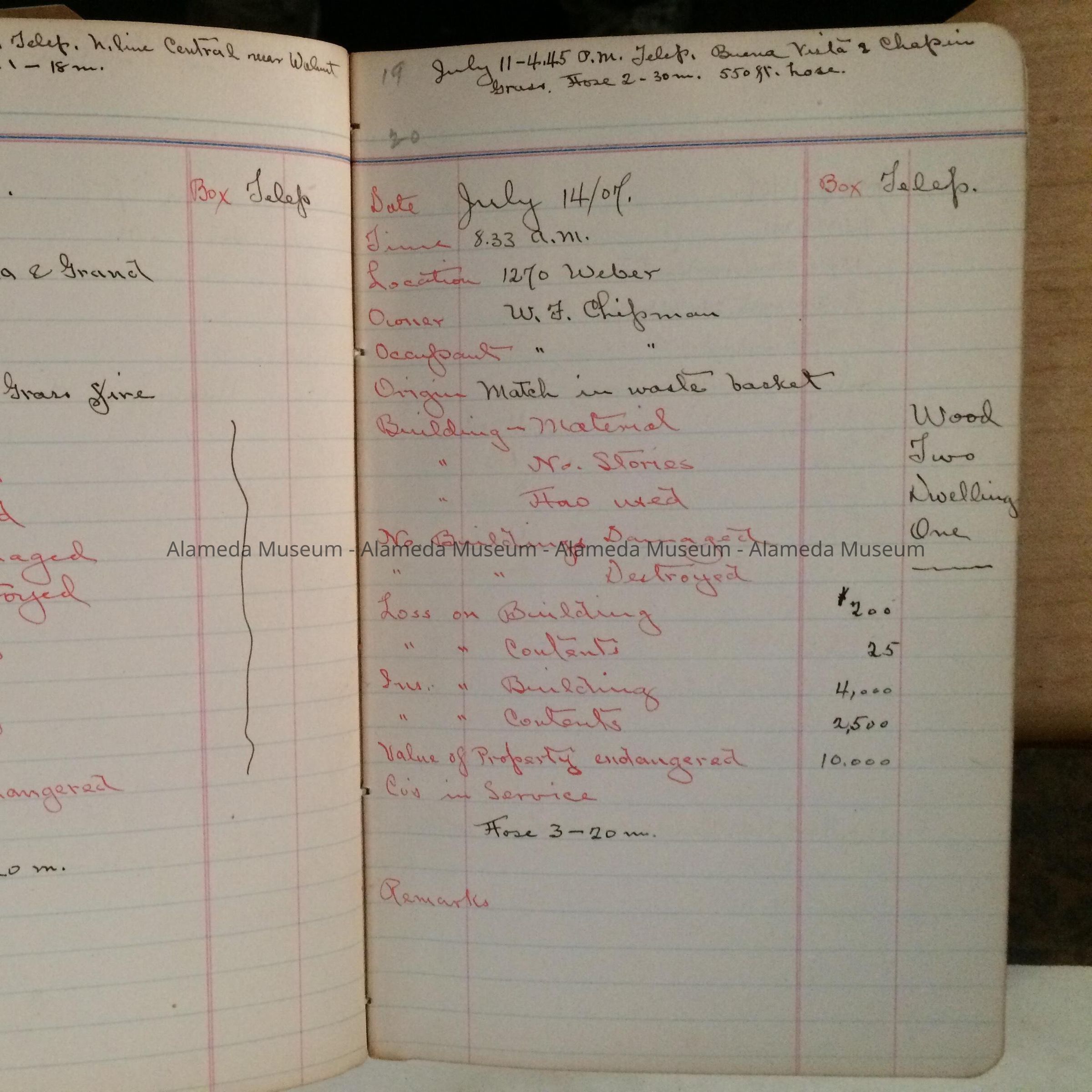 HISTORY OF OBJECT: FIRE RECORD, ALAMEDA, JOURNAL CONTAINING HAND WRITTEN NOTATIONS ON FIRES TAKING PLACE IN THE CITY OF ALAMEDA, PERIOD 1907-08. THE INFORMATION CONSISTS OF: DATE, TIME, LOCATION, OWNER, OCCUPANT, ORIGIN OF FIRE, BUILDING MATERIAL, NUMBER OF STORIES, HOW USED, NUMBER OF BUILDINGS DAMAGED, DESTROYED, LOSS ON BUILDING, AND CONTENTS, INSURANCE ON BUILDING AND CONTENTS, VALUE OF PROPERTY ENDANGERED, AND NUMBERS OF COMPANIES IN SERVICE. THE NOTATIONS ARE MOST LIKELY IN THE HAND OF CHIEF KRAUTH?