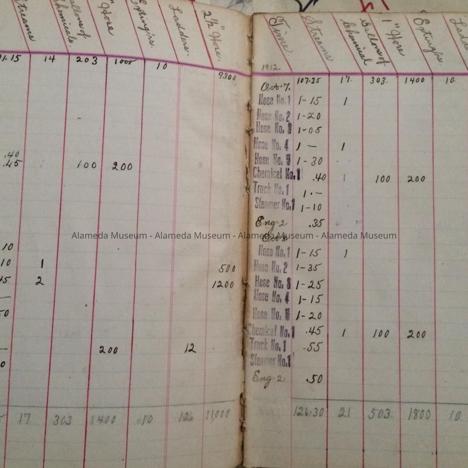 HISTORY OF OBJECT: RECORD BOOK OF STATISTICS ON MATERIALS AND FIRE COMPANIES USED TO FIGHT FIRES IN ALAMEDA, PERIOD 1912 TO 1917, BY THE ALAMEDA FIRE DEPARTMENT.