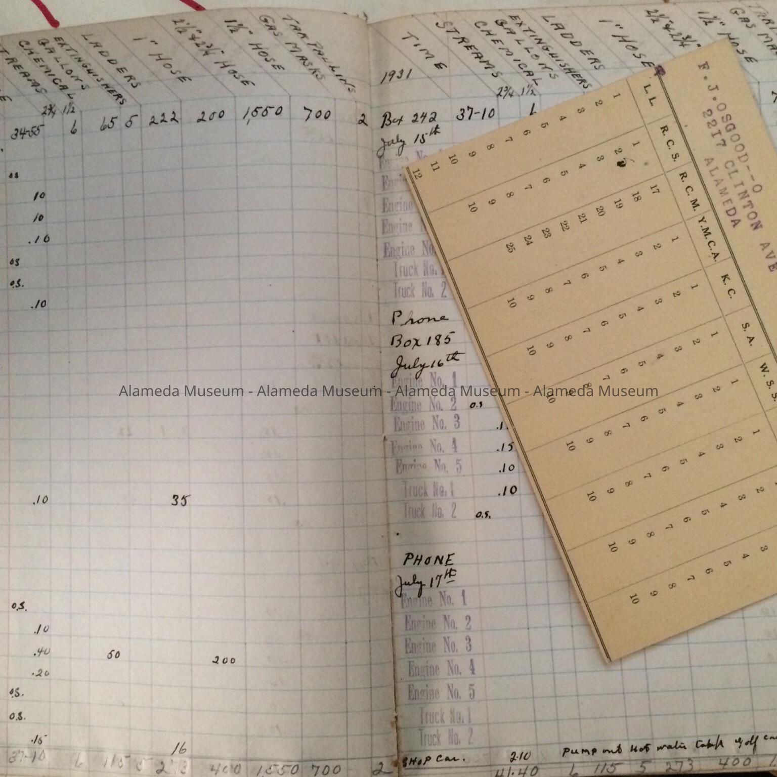 HISTORY OF OBJECT: A RECORD OF FIRE ALARMS AND WHICH FIRE STATION ANSWERED CALL, AND A LIST OF EQUIPMENT USED TO FIGHT FIRE.