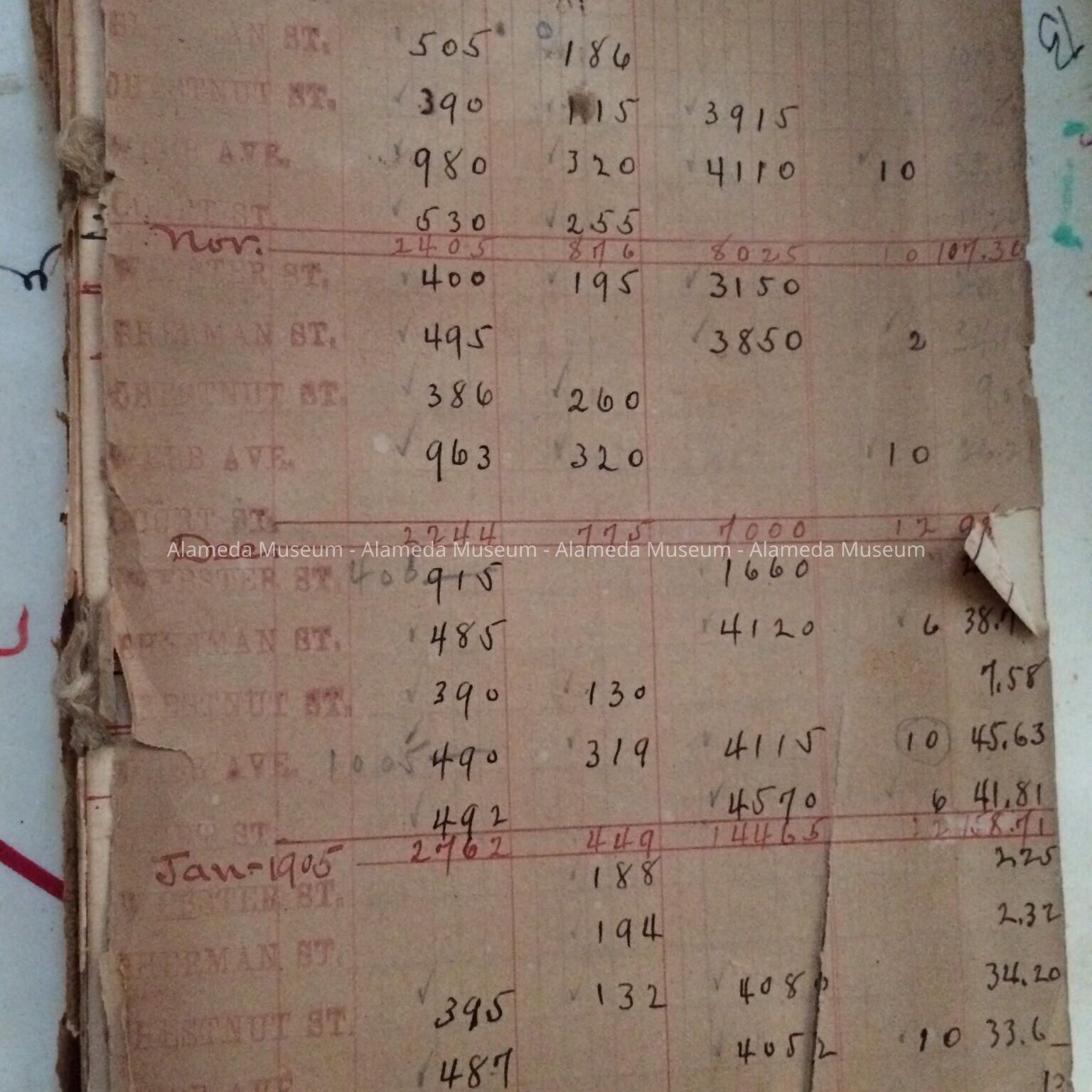 HISTORY OF OBJECT: RECORD BOOK KEPT BY THE ALAMEDA FIRE DEPARTMENT TO SHOW HOW MUCH BRAN, HAY, STRAW, AND OATS THAT WAS PURCHASED TO FEED HORSES IN THE PERIOD 1904 TO 1917. AND THE COST OF ELECTRICITY USED BY THE DIFFERENT DEPARTMENTS OF THE ALAMEDA FIRE DEPARTMENT, FROM 1927 - 1933.