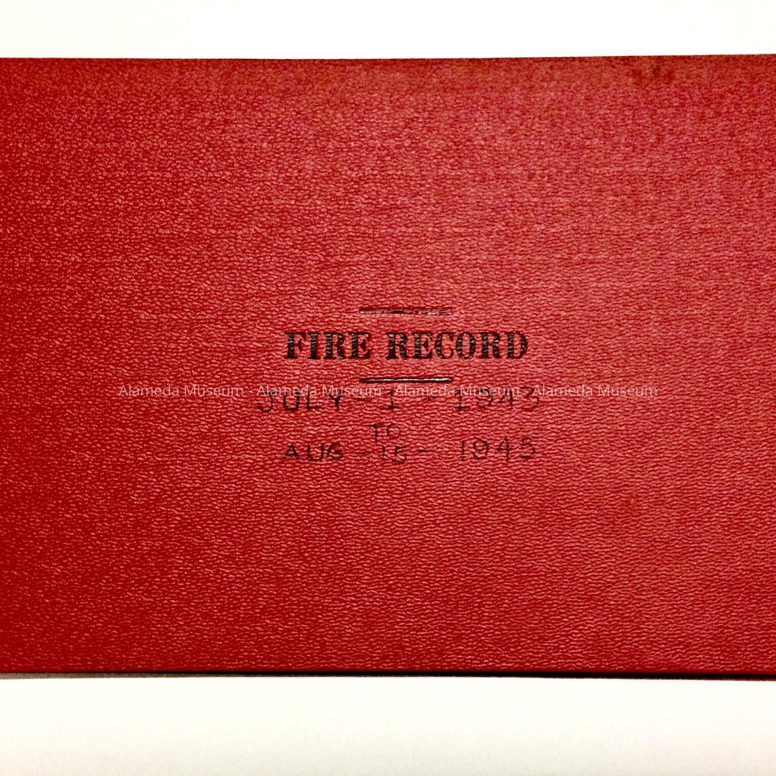 HARD-BOUND BOOK, WITH COVER OF RED-COLORED BUCKRAM. COVER HAS INCISED CAPTION, "FIRE DEPARTMENT," IN BLACK-COLORED TYPE. ADDITIONAL COVER CAPTION STATES, "JULY 1, 1943 - AUGUST 15, 1945." ENTRIES WERE MADE IN INK.