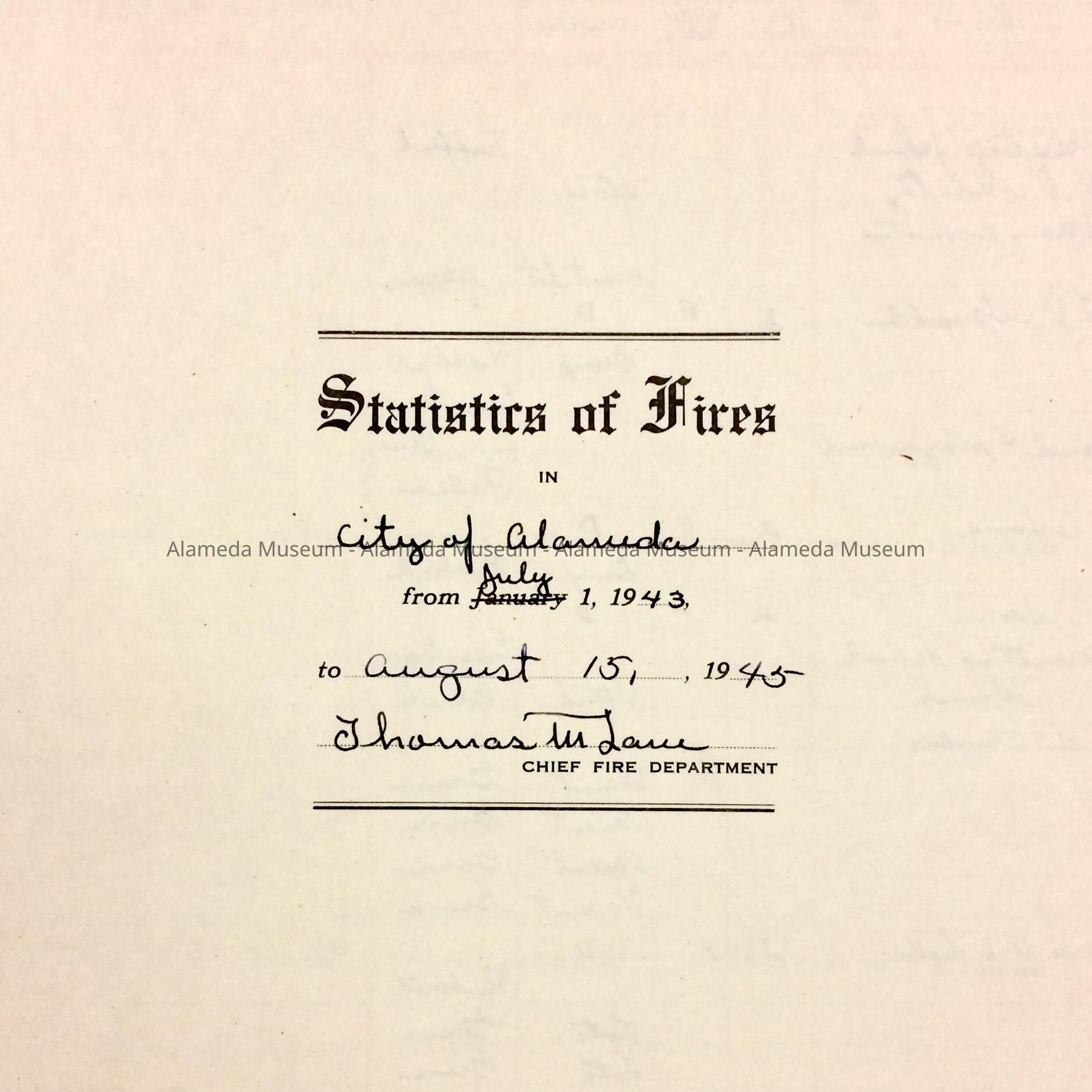 LEDGER PAGES ANNOTATING STATISTICS OF FIRES WITHIN THE CITY OF ALAMEDA DURING THE PERIOD JULY 1, 1943 TO AUGUST 15, 1945. THOMAS M LANE WAS FIRE CHIEF.