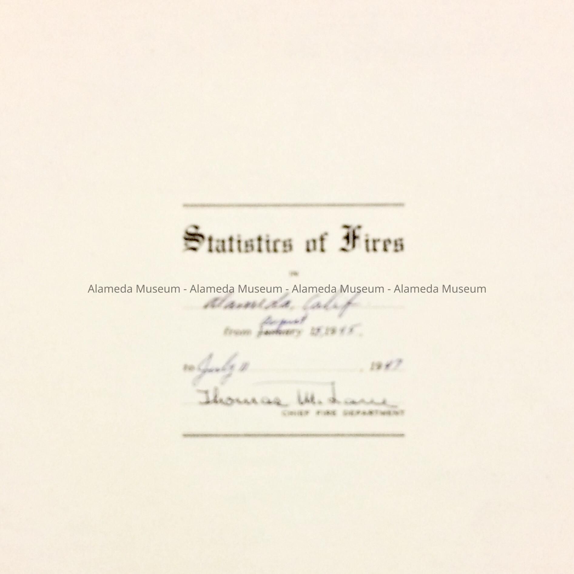 LEDGER PAGES ANNOTATING STATISTICS OF FIRES WITHIN THE CITY OF ALAMEDA DURING THE PERIOD STATED ABOVE. THOMAS M LANE WAS FIRE CHIEF.