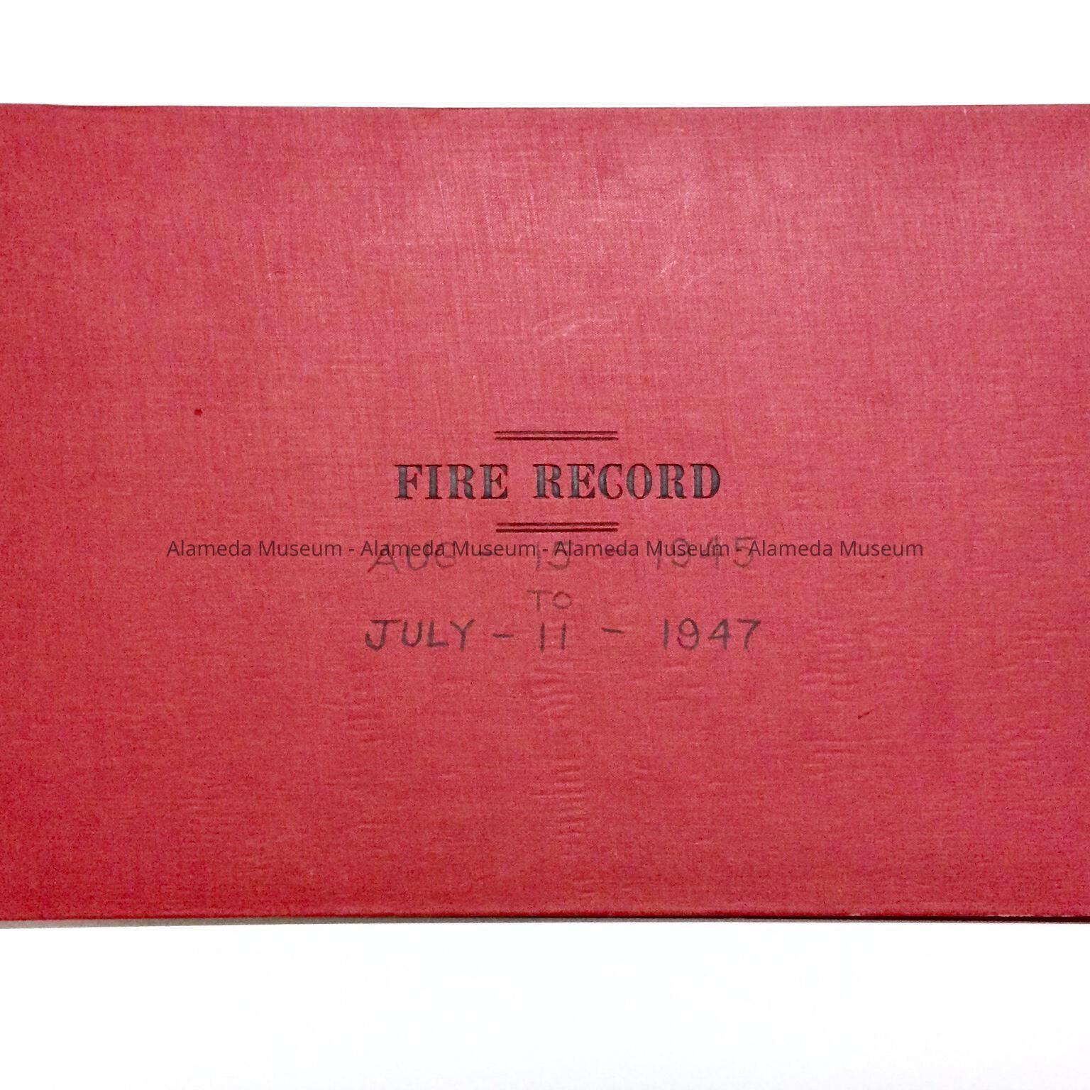 HARD-BOUND BOOK, WITH COVER OF RED-COLORED BUCKRAM. COVER HAS INCISED CAPTION, "FIRE DEPARTMENT," IN BLACK-COLORED TYPE. ADDITIONAL COVER CAPTION STATES, "AUGUST 15, 1945 - JUNE 11, 1947." ENTRIES WERE MADE IN INK.