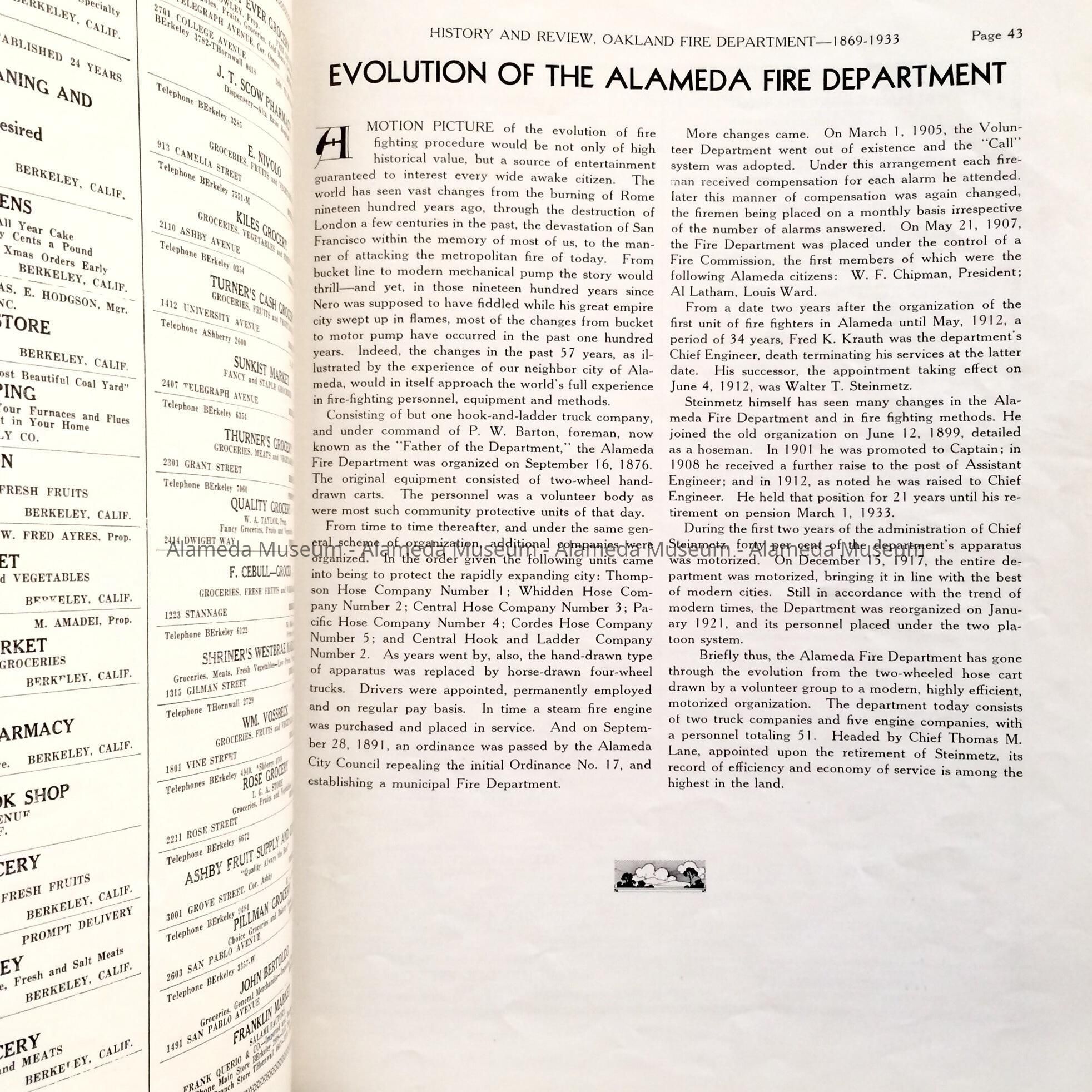 History: Magazine entitled "Fire Prevention and Public Safety" published by the Veterans Firemen's Association of Oakland and Alameda County, 1869-1933. On page 43 is a one (1) page article entitled "Evolution of the Alameda Fire Department" which is a short history of the Alameda Fire Department established in 1876. Object given to the Alameda Historical Society, numbered 999, prior to 1971 and never catalogued.
