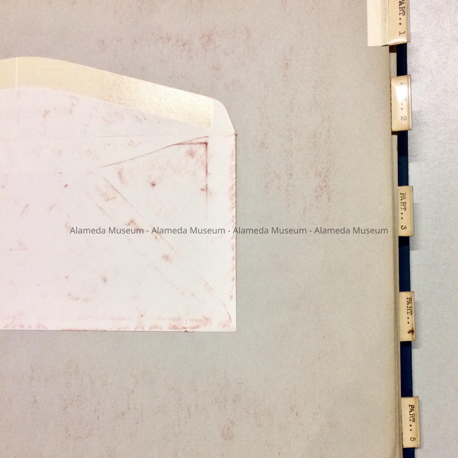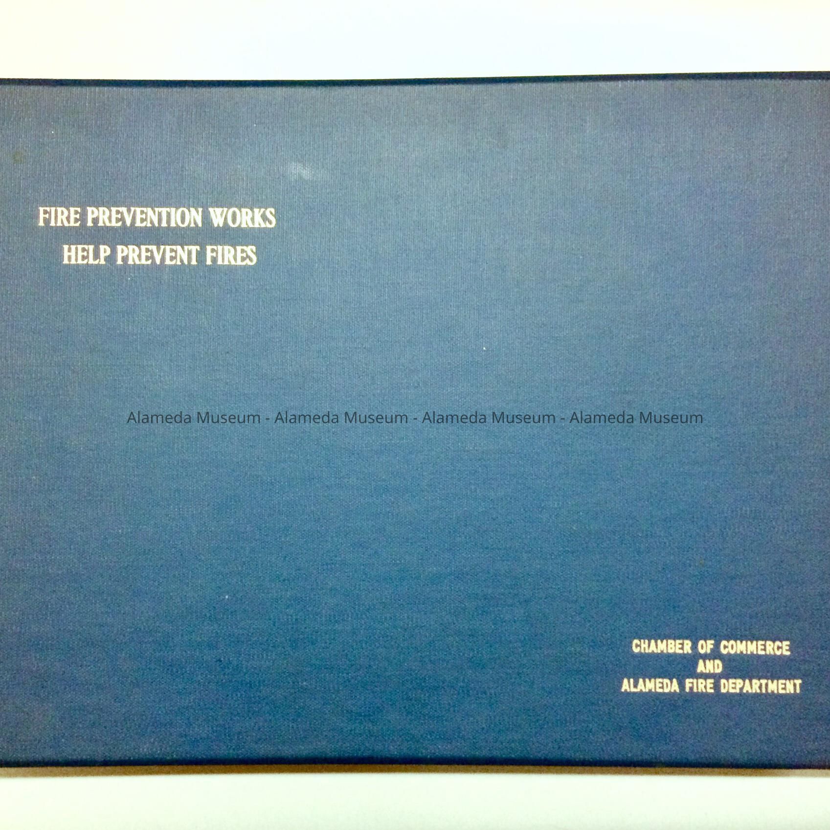 Description: Loose leaf scrapbook with hard bound cover of blue colored plasticized buckram that has an incised caption in gold, “Fire Prevention Works-Help Prevent Fires-Chamber of Commerce & Alameda Fire Dept."