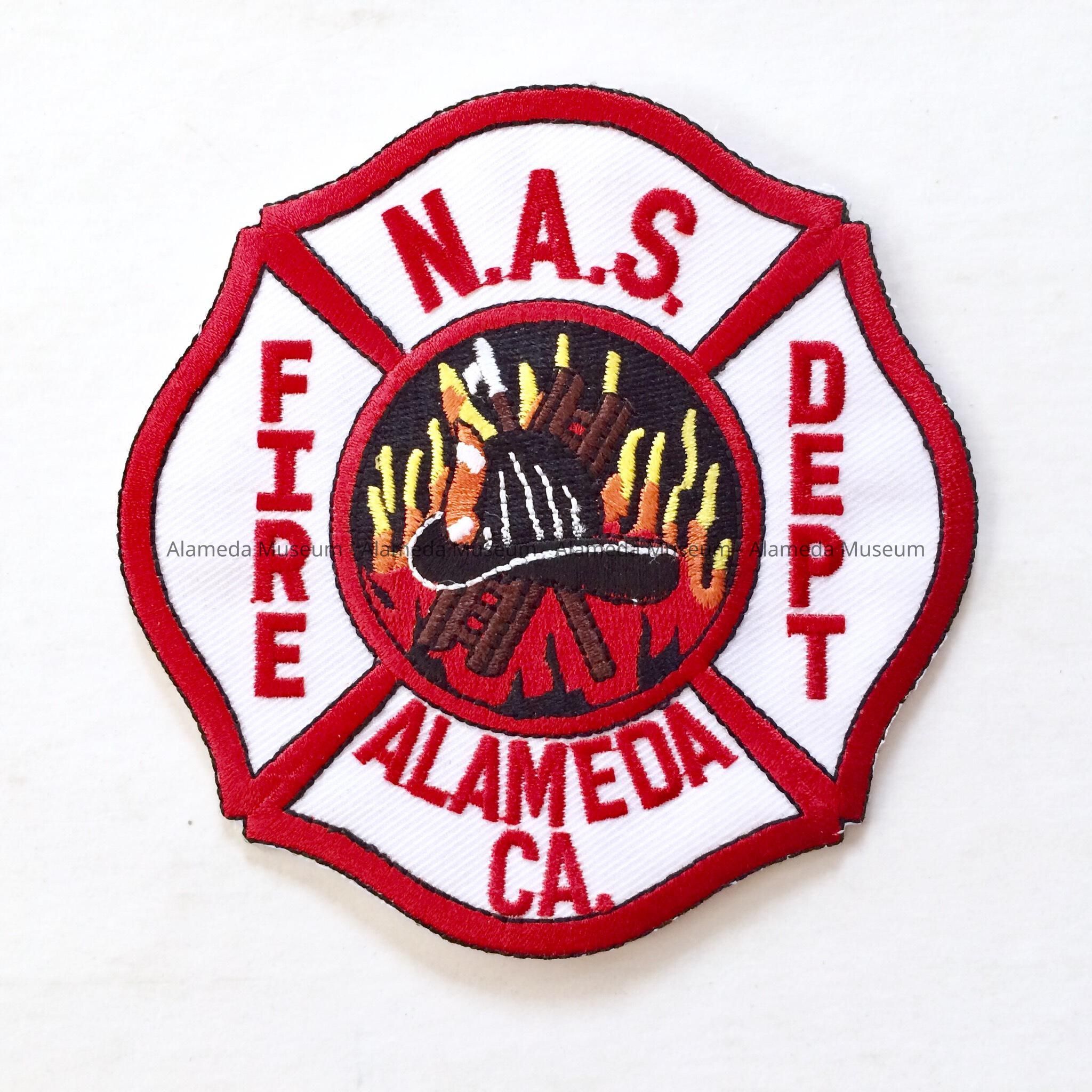 Description: Machine embroidered patch (or emblem) in red, yellow, orange, and brown thread on a white color background. The patch logo states: "N.A.S. Fire Dept., Alameda, CA".
