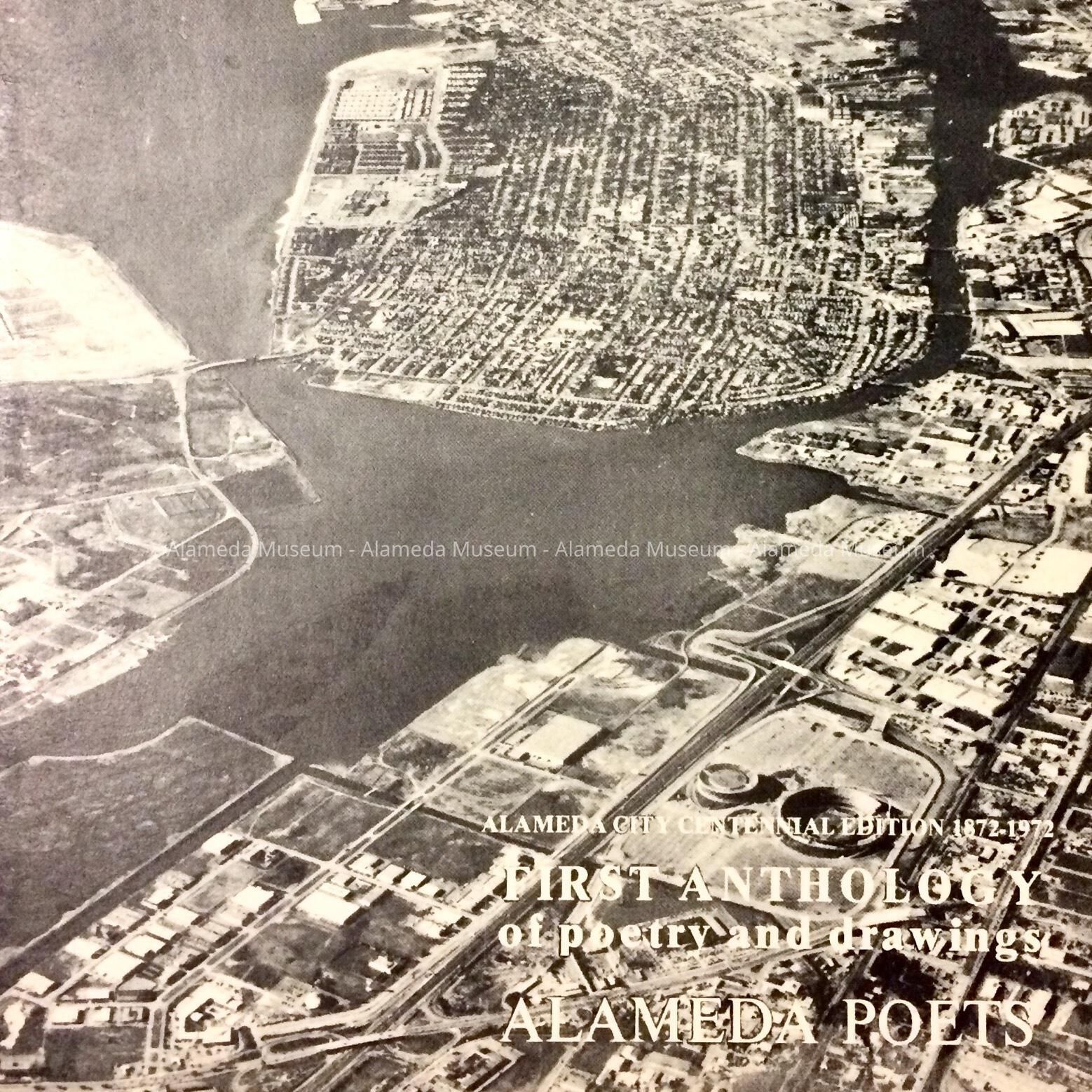 A SOFT-BOUND BOOK LET, WITH ILLUSTRATED COVER DEPICTING AN AERIAL VIEW OF ALAMEDA IN BLACK AND WHITE. COVER HAS A PRINTED CAPTION, "FIRST ANTHOLOGY ON POETRY AND DRAWINGS, ALAMEDA POETS."