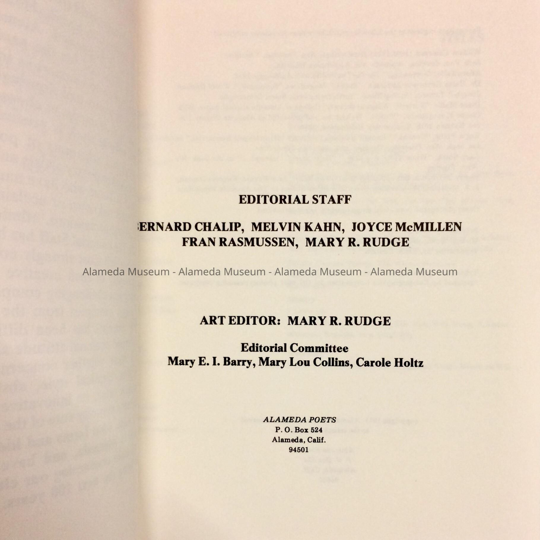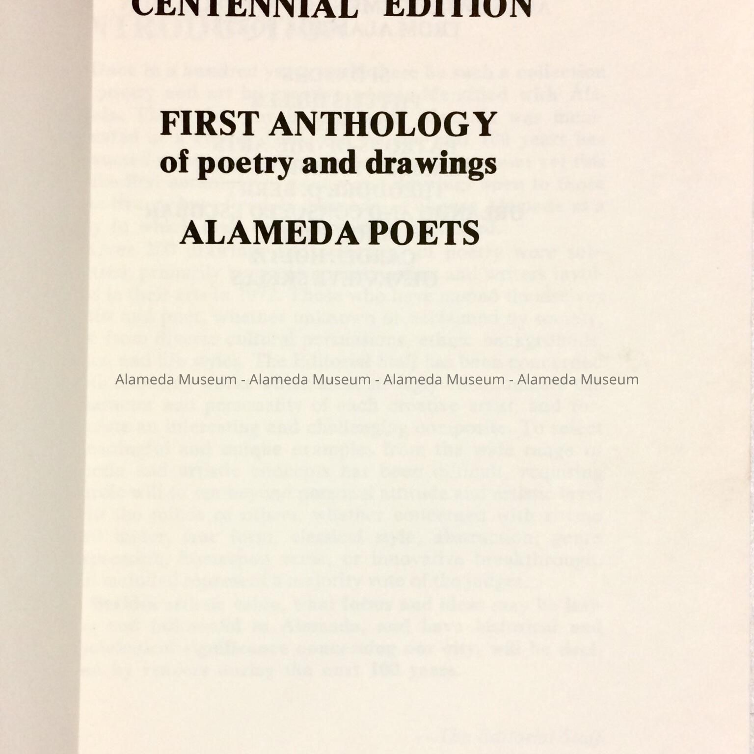 ALAMEDA CITY CENTENNIAL EDITION, FIRST ANTHOLOGY OF POETRY AND DRAWINGS, ALAMEDA POETS, 1972. THE LATE MARY R RUDGE, POET LAUREATE OF ALAMEDA, WAS ON THE EDITORIAL STAFF. THE PUBLICATION WAS ILLUSTRATED BY AL AMEDA ARTISTS AS WELL.