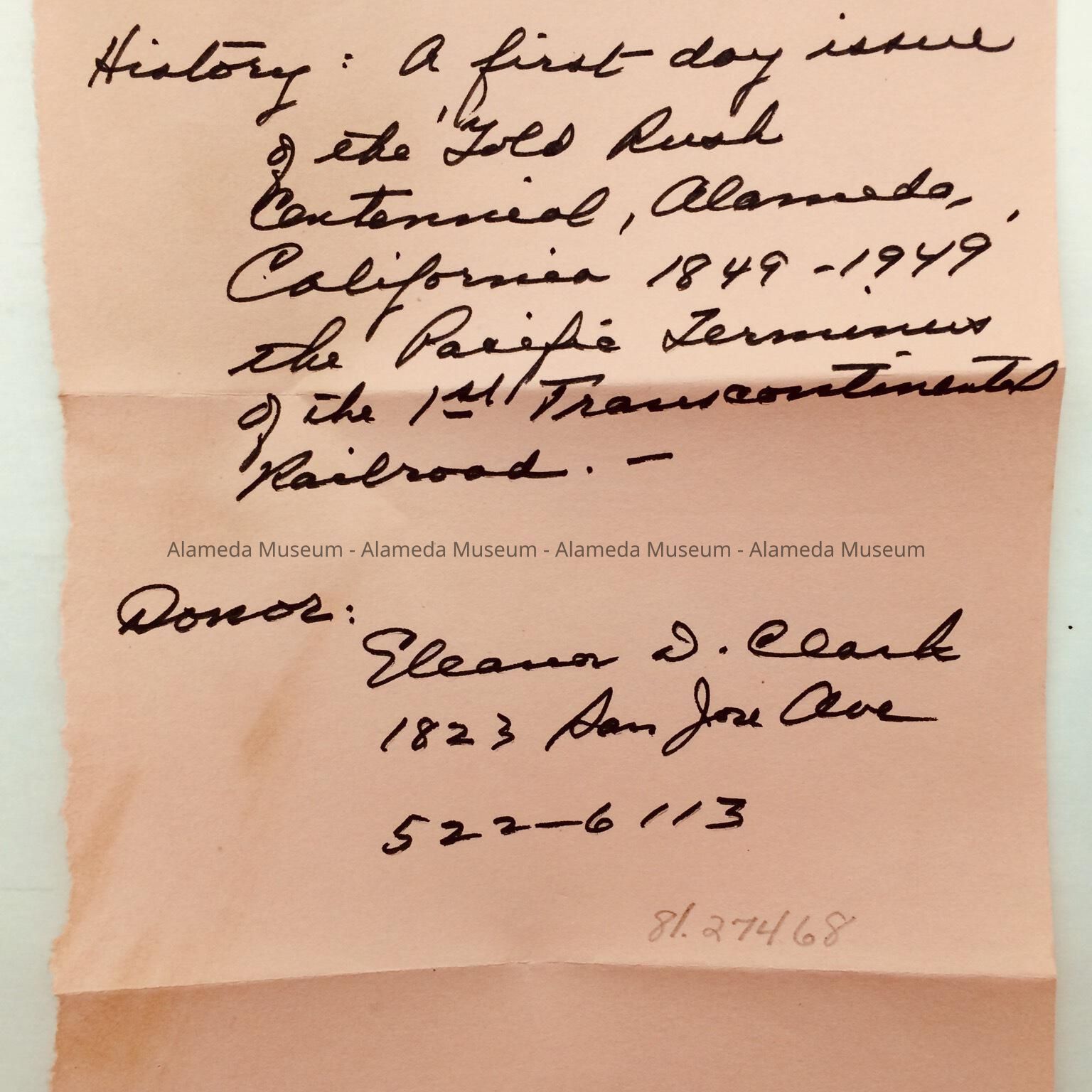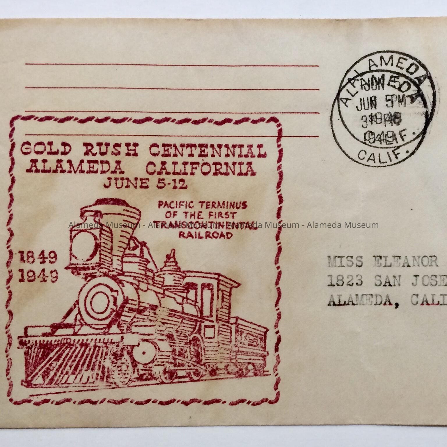 History of object: A first day issue of the "Gold Rush Centennial, Alameda, California 1849-1949, the Pacific Terminus of the First Transcontinental Railroad.