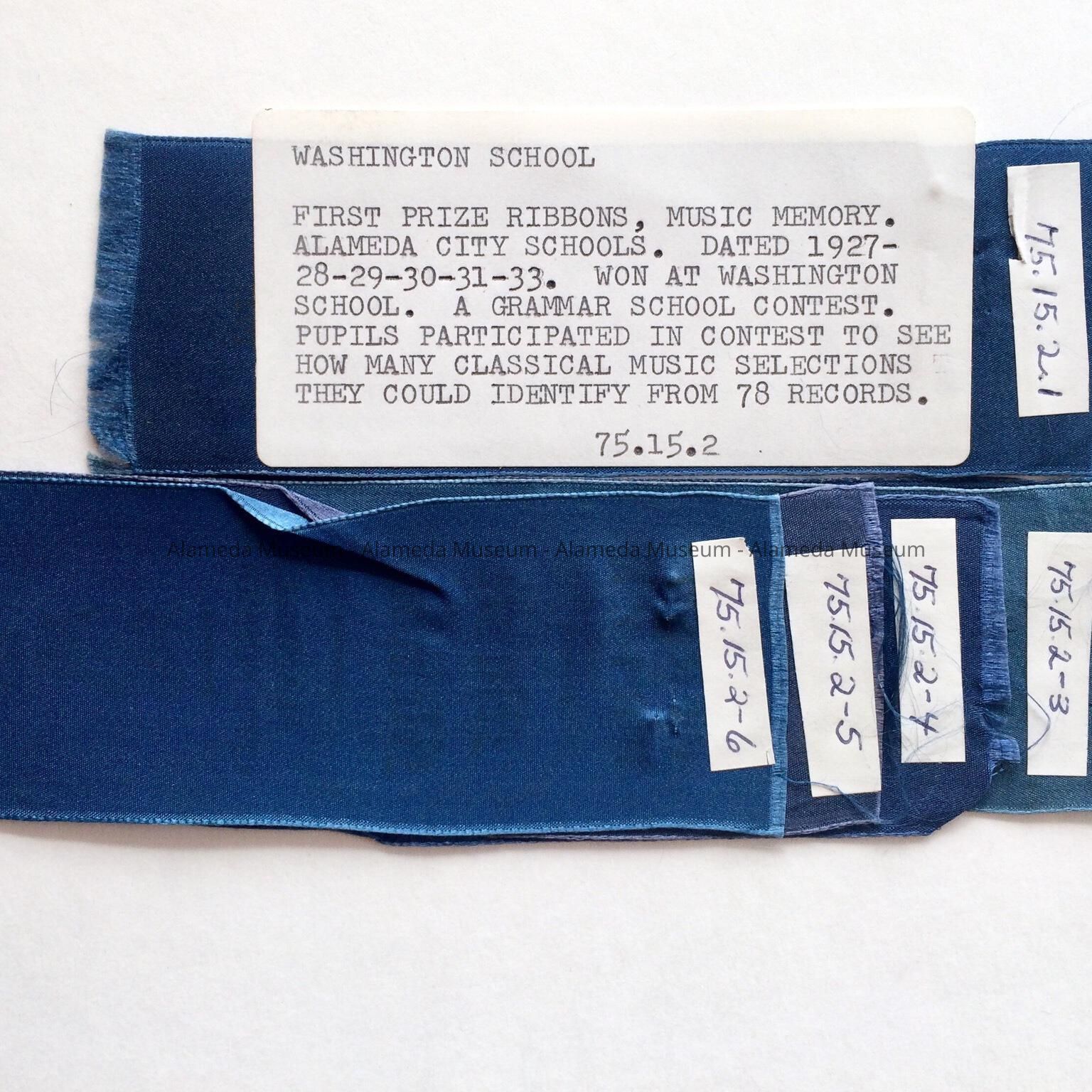 HISTORY OF OBJECT: FIRST PRIZE RIBBONS, MUSIC MEMORY. ALAMEDA CITY