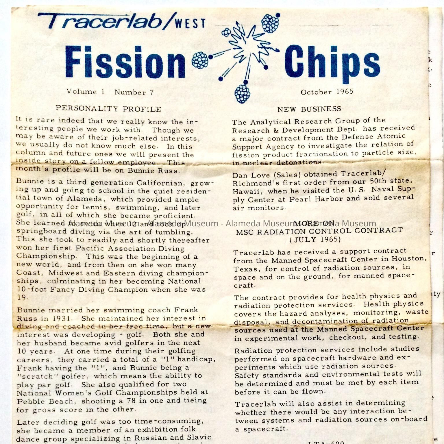 A PUBLICATION ENTITLED, "FISSION CHIPS," FOR OCTOBER 1965. THE FRONT PAGE HAS A BIOGRAPHY OF THE LATE BUNNY FERGUS RUSS. SHE WAS A CHAMPION SWIMMER AND GOLFER.