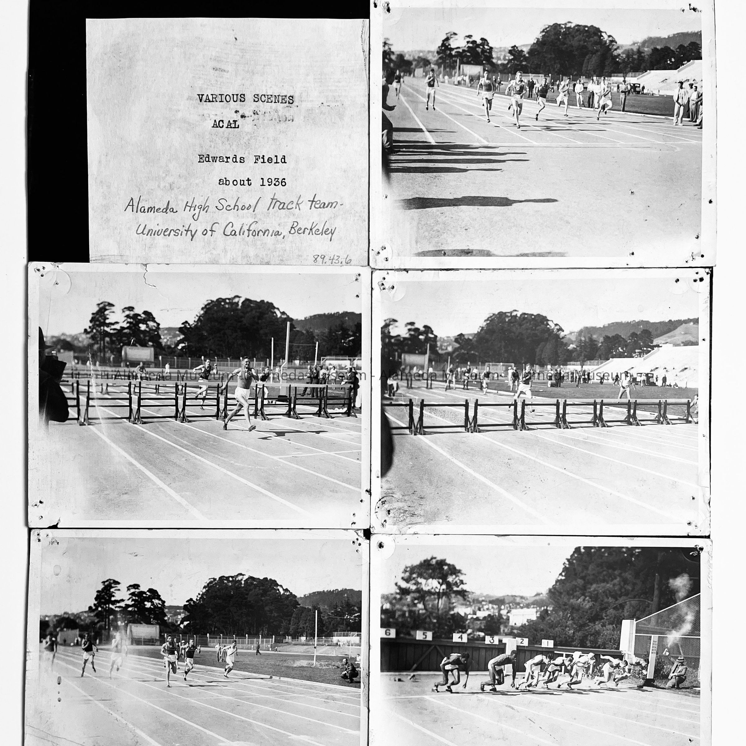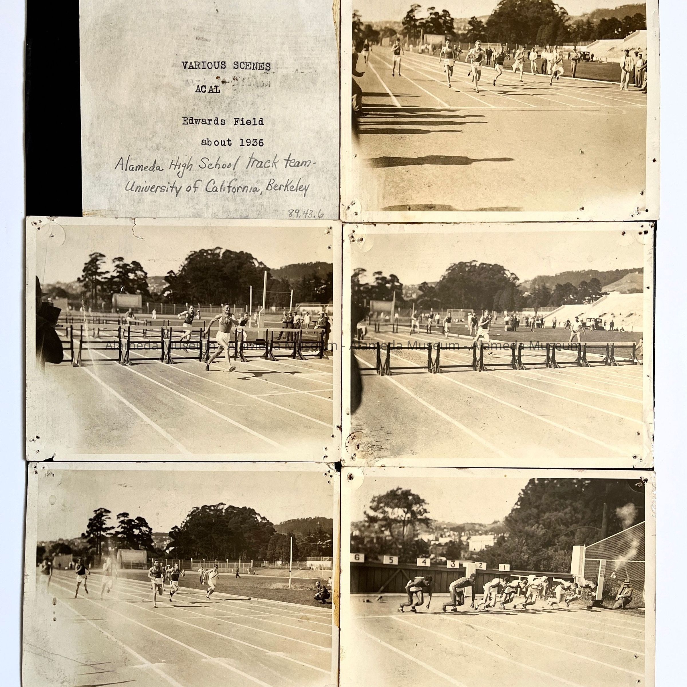 Five photographic scenes depicting the Alameda High School track team racing at Edwards Field, University of California, Berkeley.
