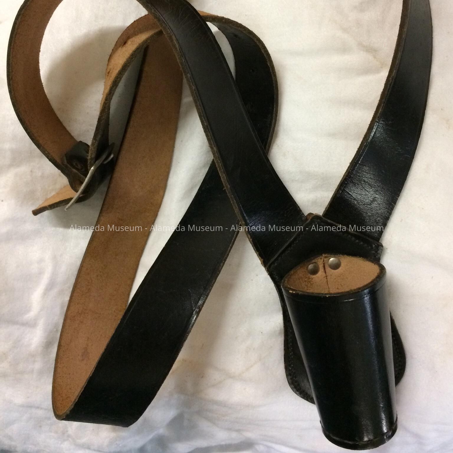 DESCRIPTION: Black leather with adjustable buckle (chrome plated). Cup is riveted to strap and holds bottom of flag pole.