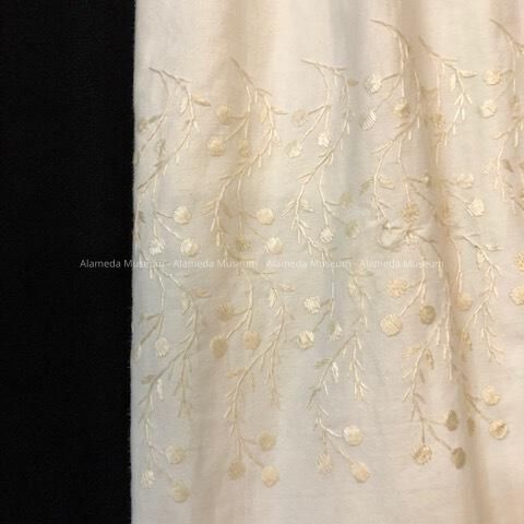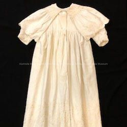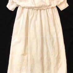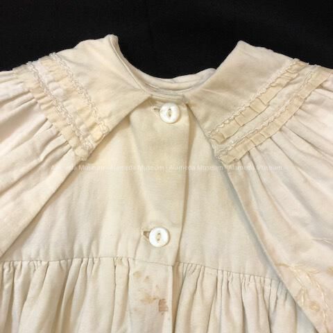 FULL-LENGTH, HIGH-WAISTED BABY COAT OF HEAVY WHITECOLORED COTTON. ATTACHED BERTHA-STYLE COLLAR. MACHINE EMBROIDERY, WITH THE SAME PATTERN REPEATED IN LOWER PORTION OF COAT. GARMENT IS LONG-SLEEVED AND COMPLETELY LINED IN FLANNEL. THE UPPER PART OF THE COST IS SECURED WITH TWO BUTTONS.