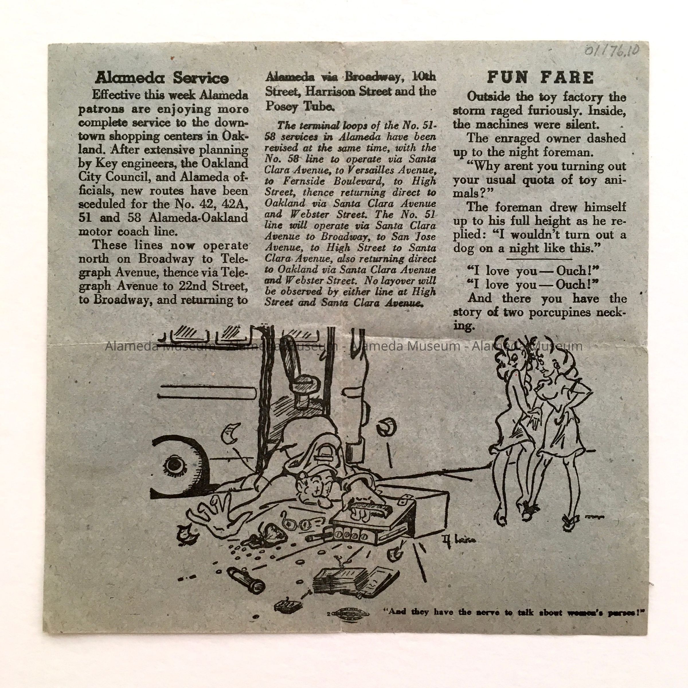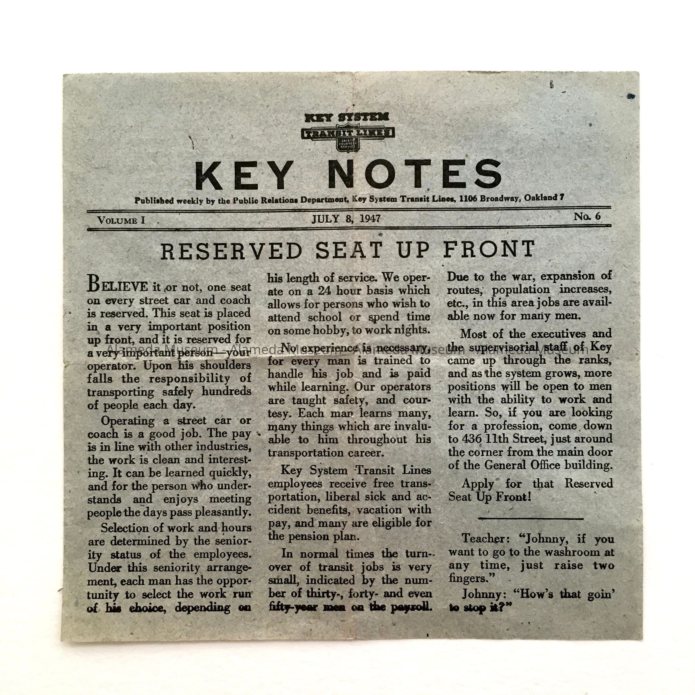 A FLYER ISSUED BY THE KEY SYSTEM TRANSPORTATION COMPANY, DATED JULY 8, 1947, WHICH INCLUDES A DESCRIPTION OF THE ALAMEDA SERVICE OF THE NUMBERS 42, 51, AND 58 MOTOR COACH BUSES. ROUTE INFORMATION IS ALSO CONTAINED THEREIN.