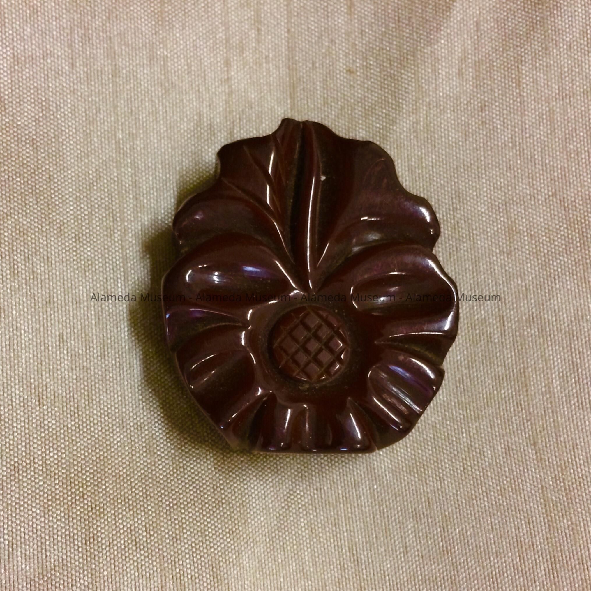 Description: Stylized floral brooch of brown colored Bakelite with metal clasp for attaching.
