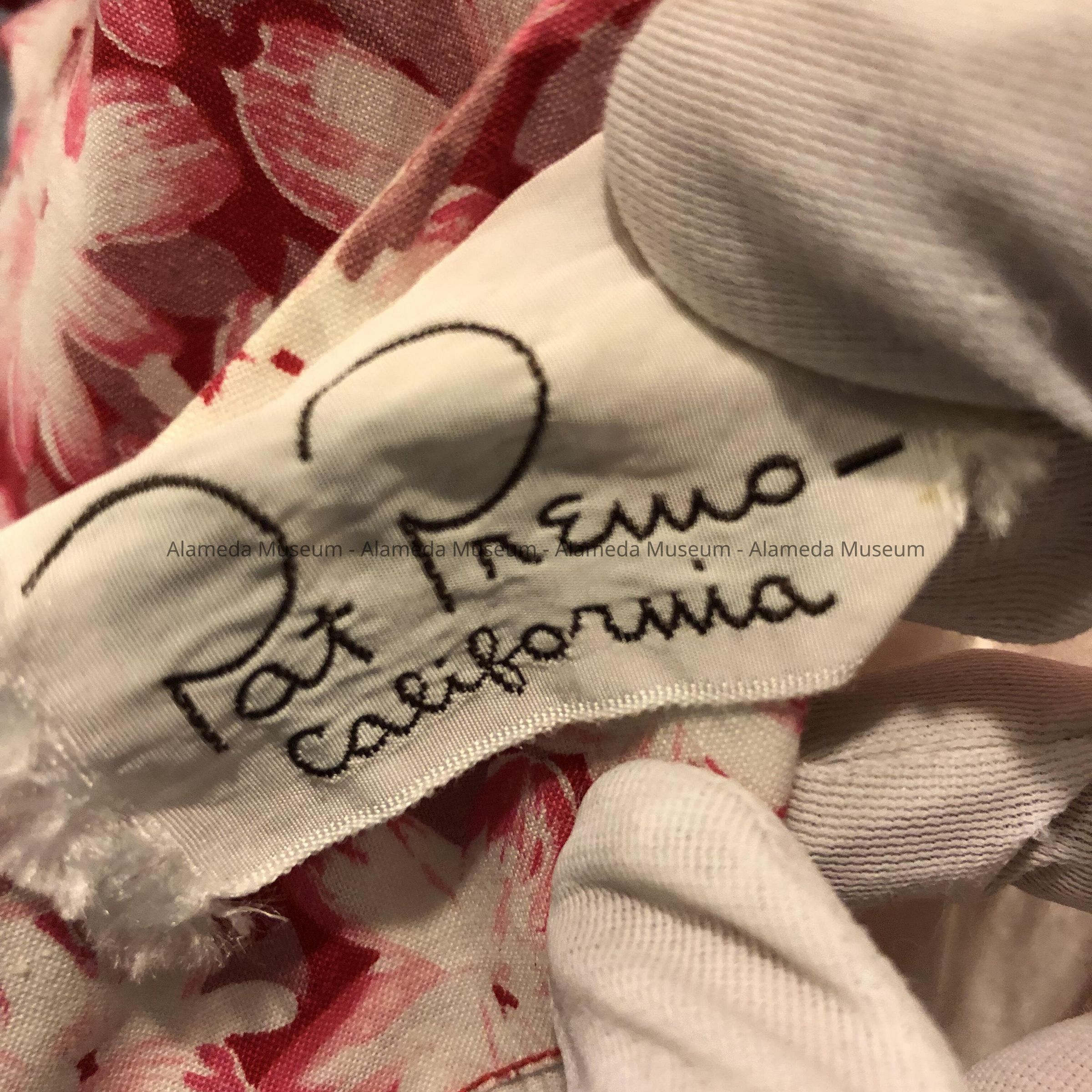 ONE-PIECE DRESS OF FLORAL PATTERN COTTON.. FLOWERS IN WHITE AND VARYING SHADES OF ROSE. BODICE OF DRESS IS LINED AND HAS SHORT SLEEVES. SILK LABEL STATES, "PAT PREMO, CALIFORNIA." DRESS HAS A ZIPPER FROM THE COLLAR TO THE WAIST. BACK HAS A SLIGHTLY FLARED SKIRT.