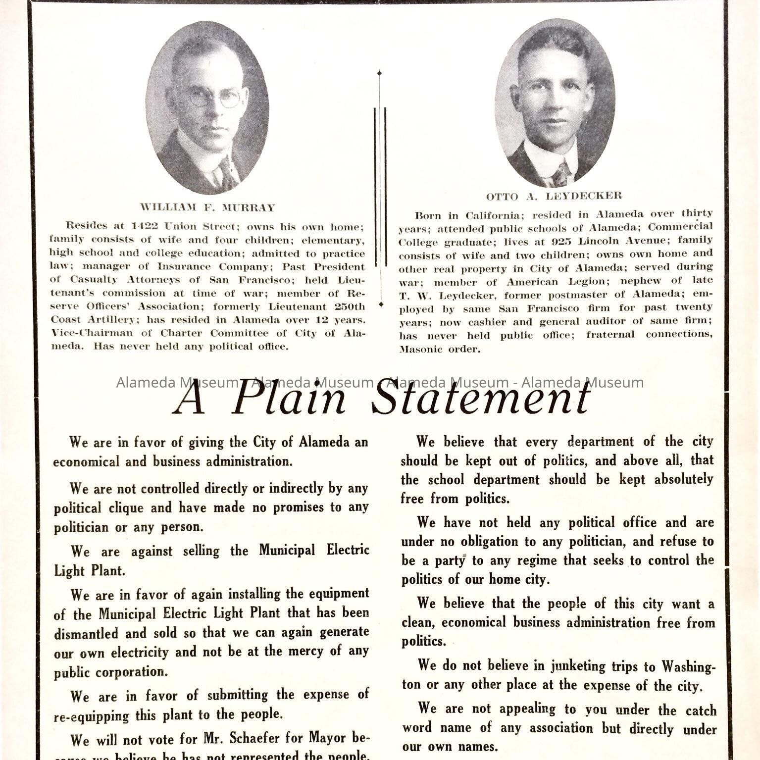 History of Object: The stated platform of two candidates running for city councilman, in the 1931 Alameda elections, Wm. F. Murray and Otto A. Leydecker.