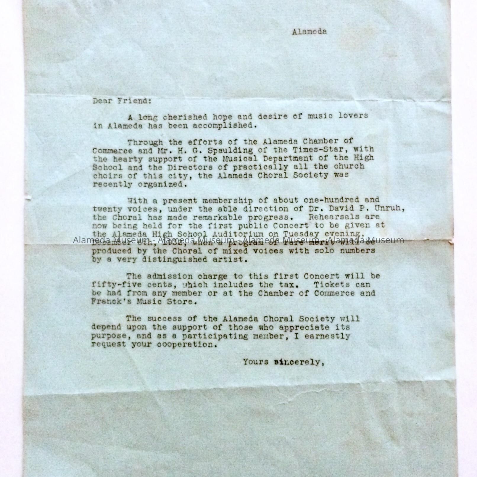 HISTORY OF OBJECT: A MASS-PRODUCED LETTER OR FLIER CONCERNING THE FUNDING OF THE ALAMEDA CHORAL SOCIETY UNDER THE AUSPICES OF THE ALAMEDA CHAMBER OF COMMERCE AND MR. H.G. SPAULDING OF THE ALAMEDA TIMES-STAR NEWSPAPER.