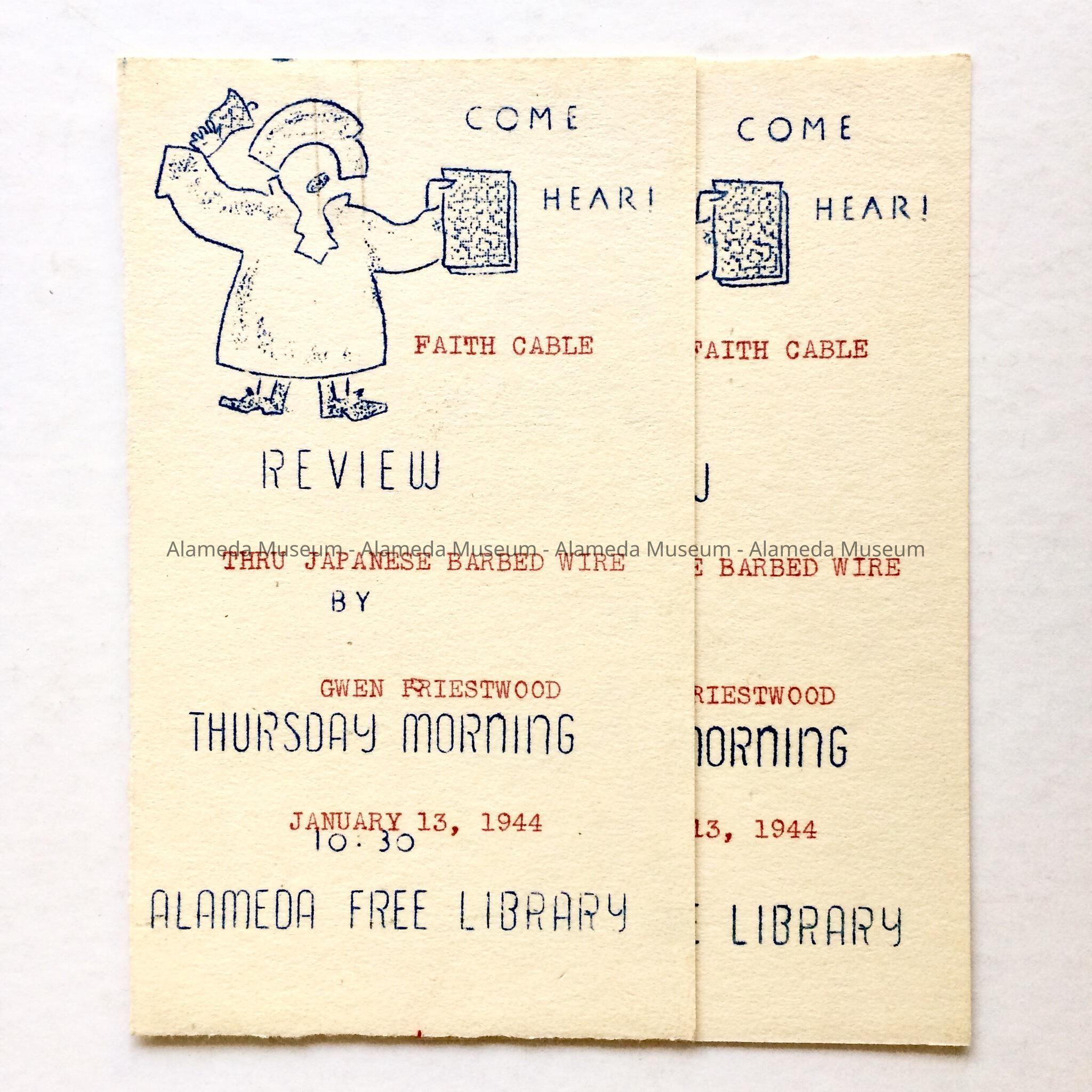 Flyer concerning a review of a book entitled "Through Japan's Barbed Wire" by Gwen Priestwood held January 13, 1944 at the Alameda Free Library.