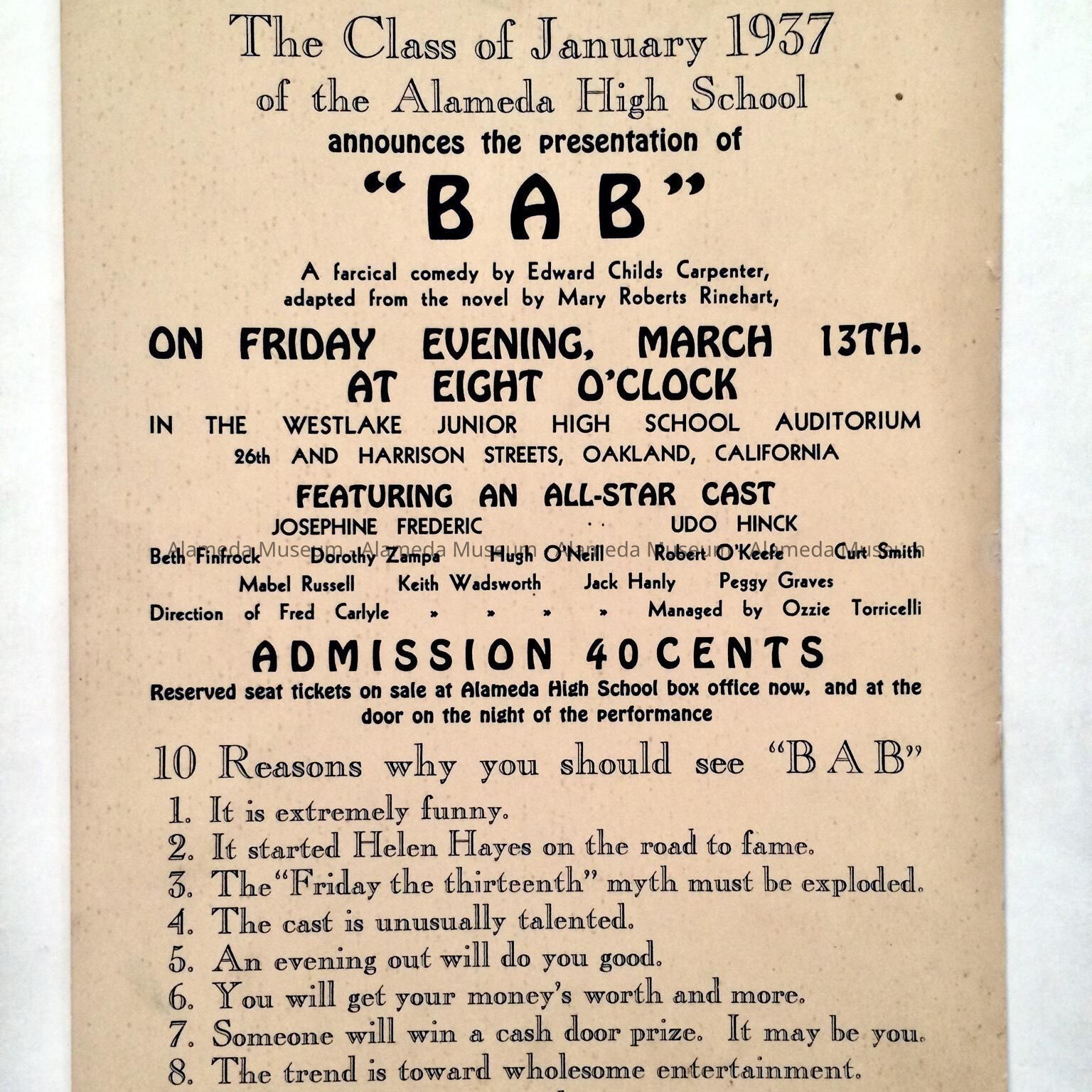 HISTORY OF OBJECT: A FLYER FOR THE PLAY "BAB," PRESENTED BY THE ALAMEDA HIGH SCHOOL CLASS OF JANUARY 1937. THE DONOR'S LATE HUSBAND, JACK HANLY, WAS A MEMBER OF THE CAST.