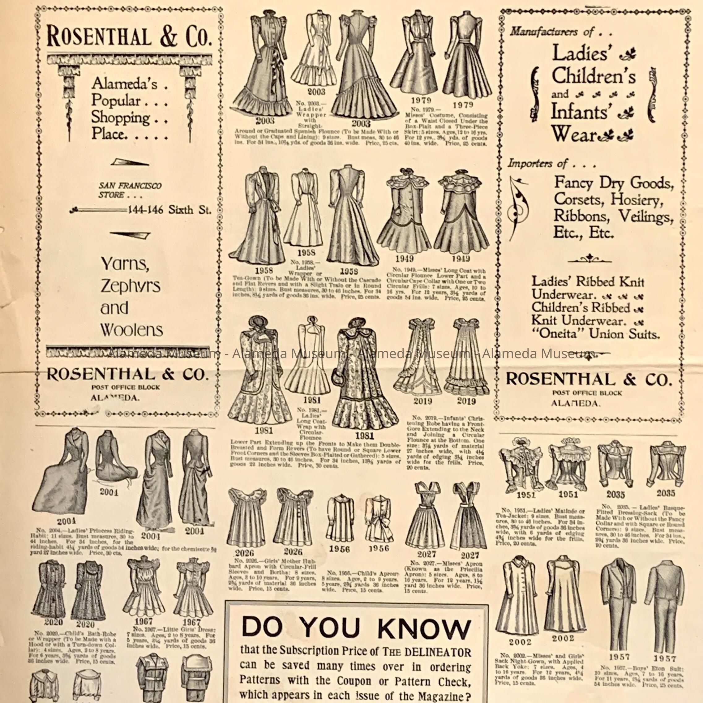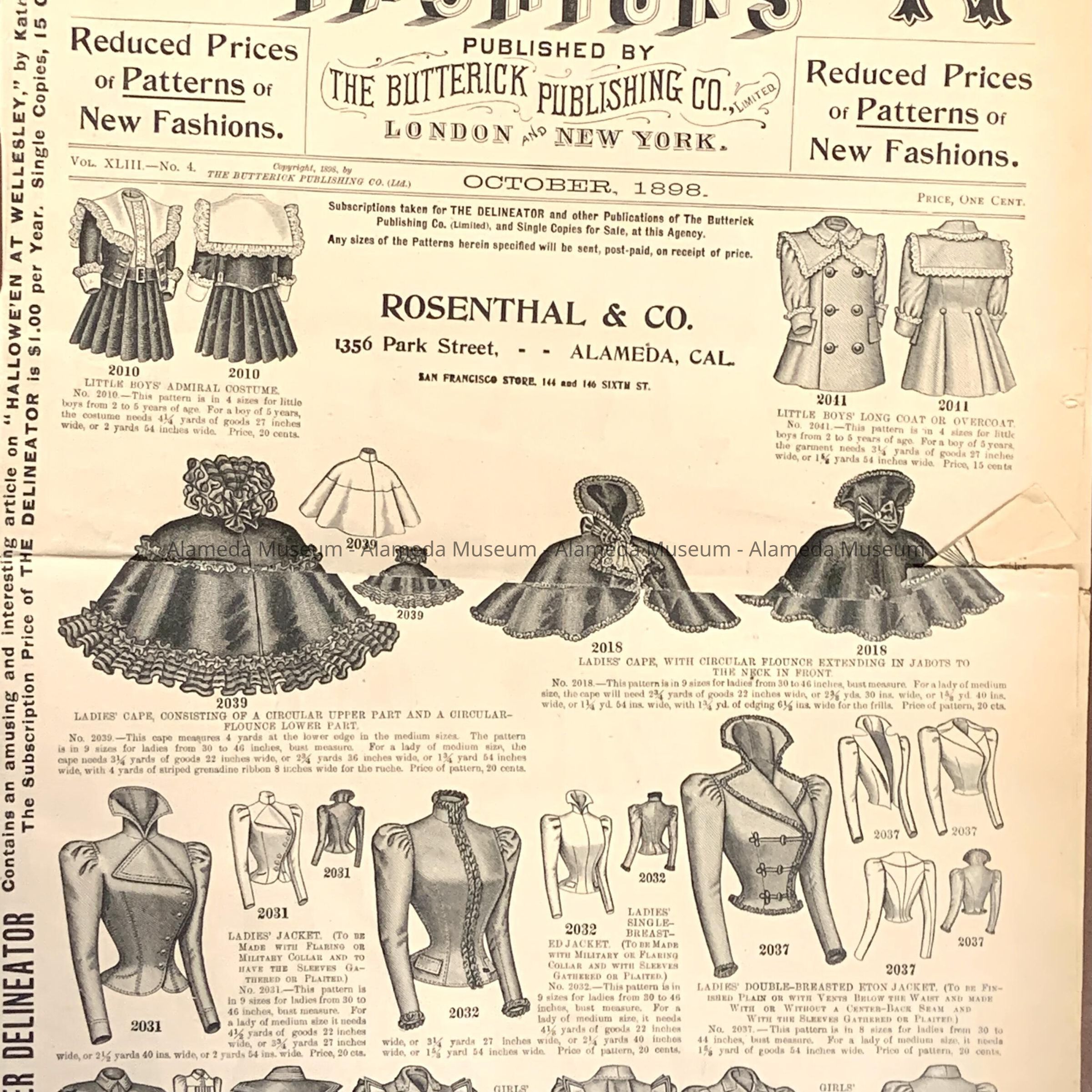 History of Object: A publication illustrated with current fashions for women, girls and boys available on Butterick & Co. sewing patterns sold by Rosenthal & Co., 1356 Park Street, Alameda.