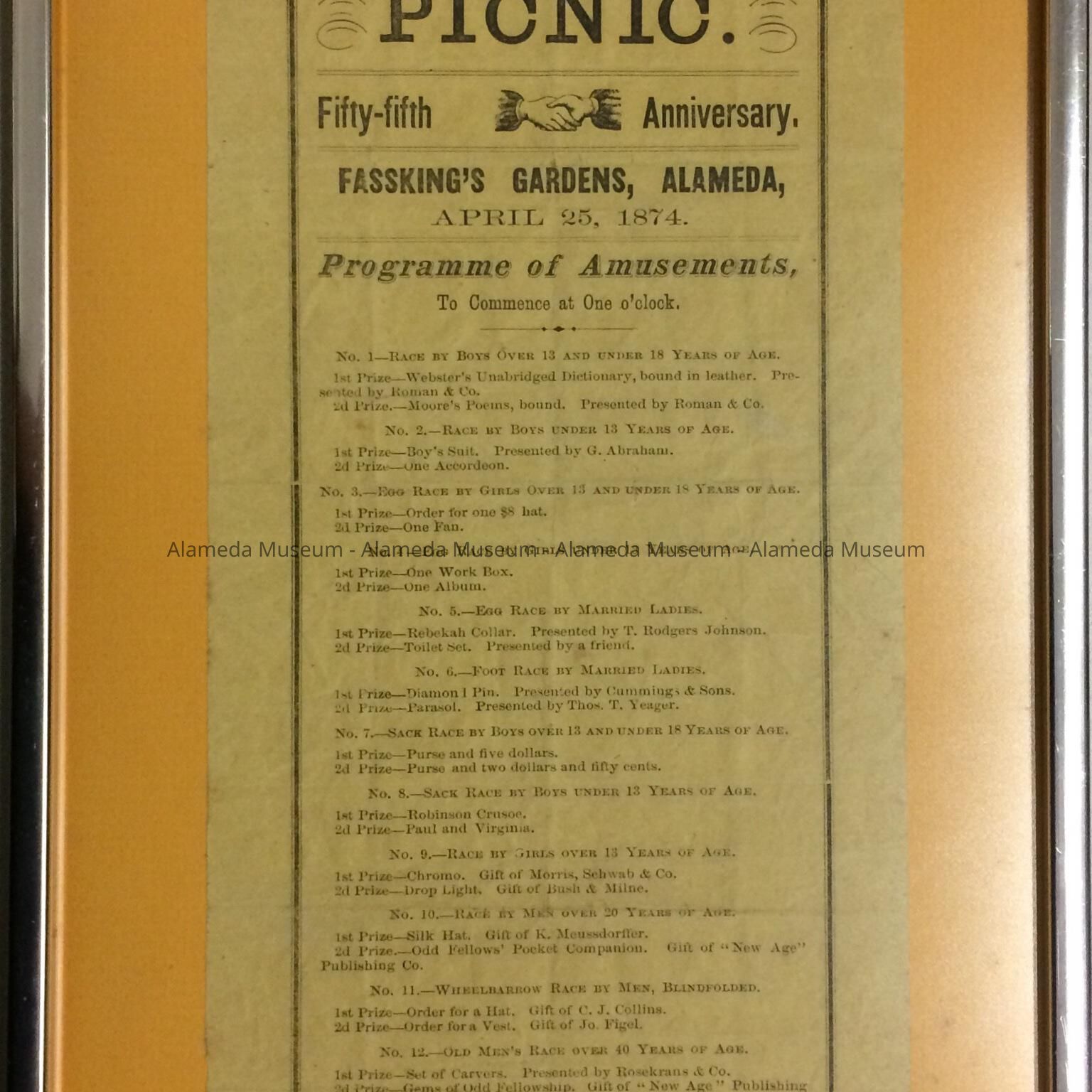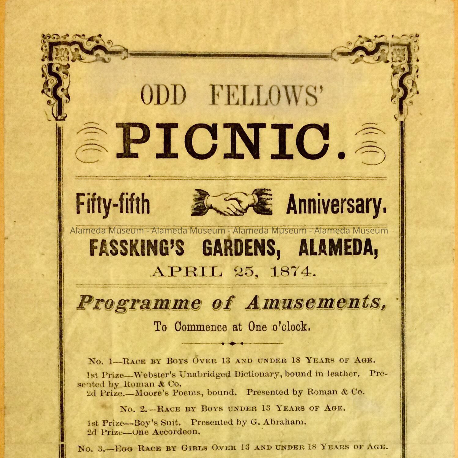 History: Program for the fifty-fifth anniversary picnic of the Odd Fellows' fraternity, at Fassking's Gardens, Alameda, April 25, 1874, to Commence at One o'clock.