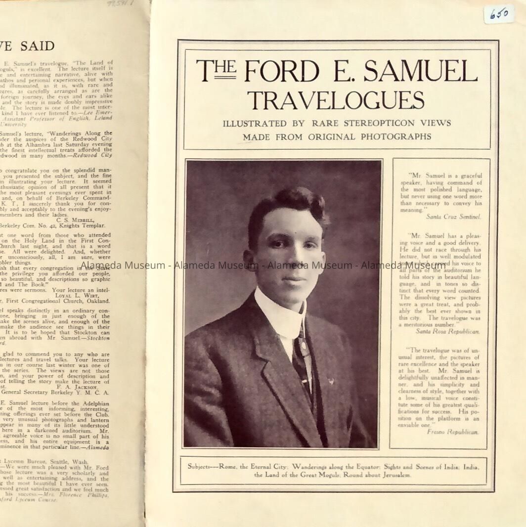 Description: Booklet style flyer/program folds out in four (4) sections. Cover has bold printed caption "The Ford E. Samuel Travelogues" with an accompanying portrait in brown colored type on an off white colored background.