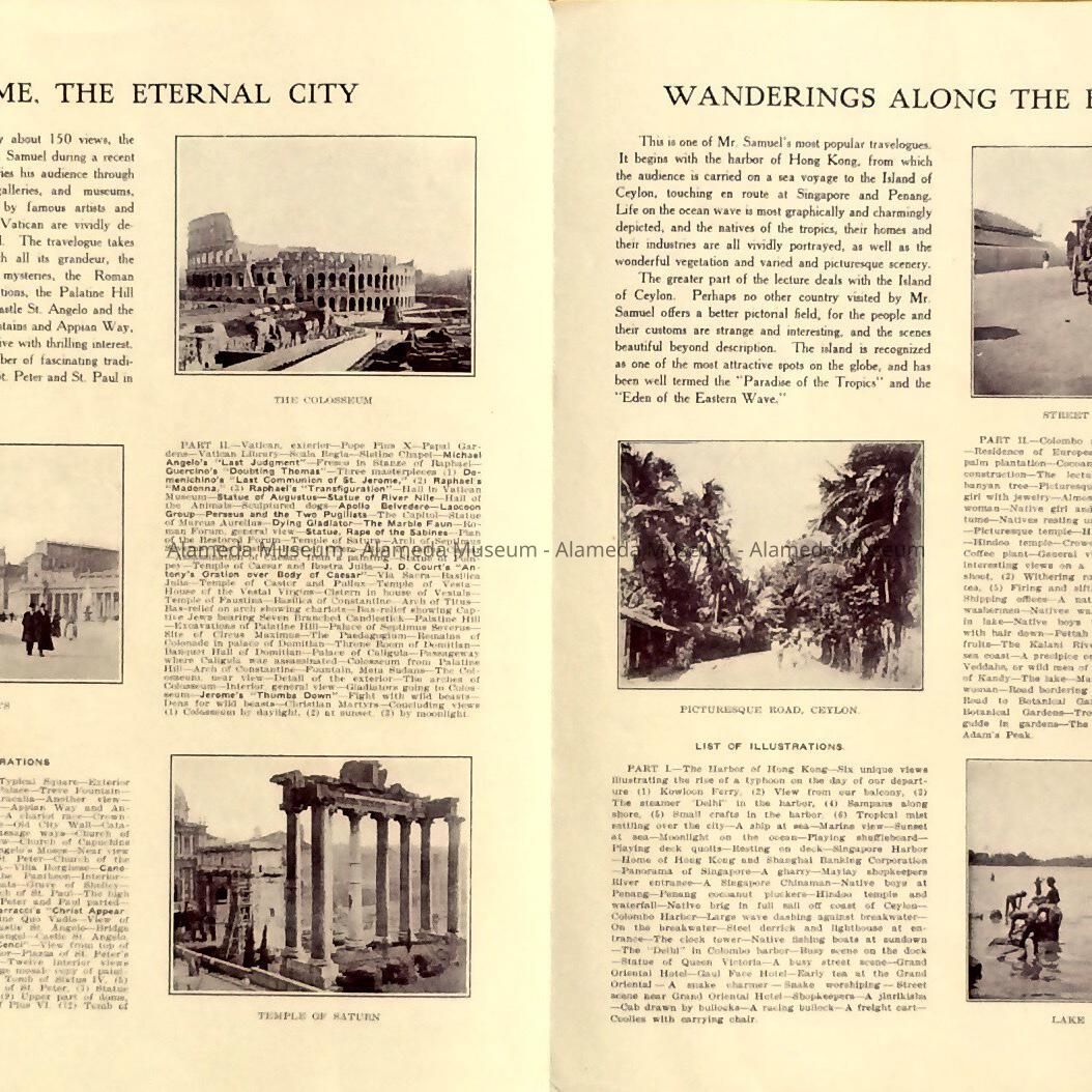 History: Flyer/program for the illustrated lectures given by Ford E. Samuel. In his traveling lectures, stereopticon views of his travels throughout the world were projected on a wall accompanied by a monologue. Lectures were given prior to his serving as the Postmaster of the City of Alameda.