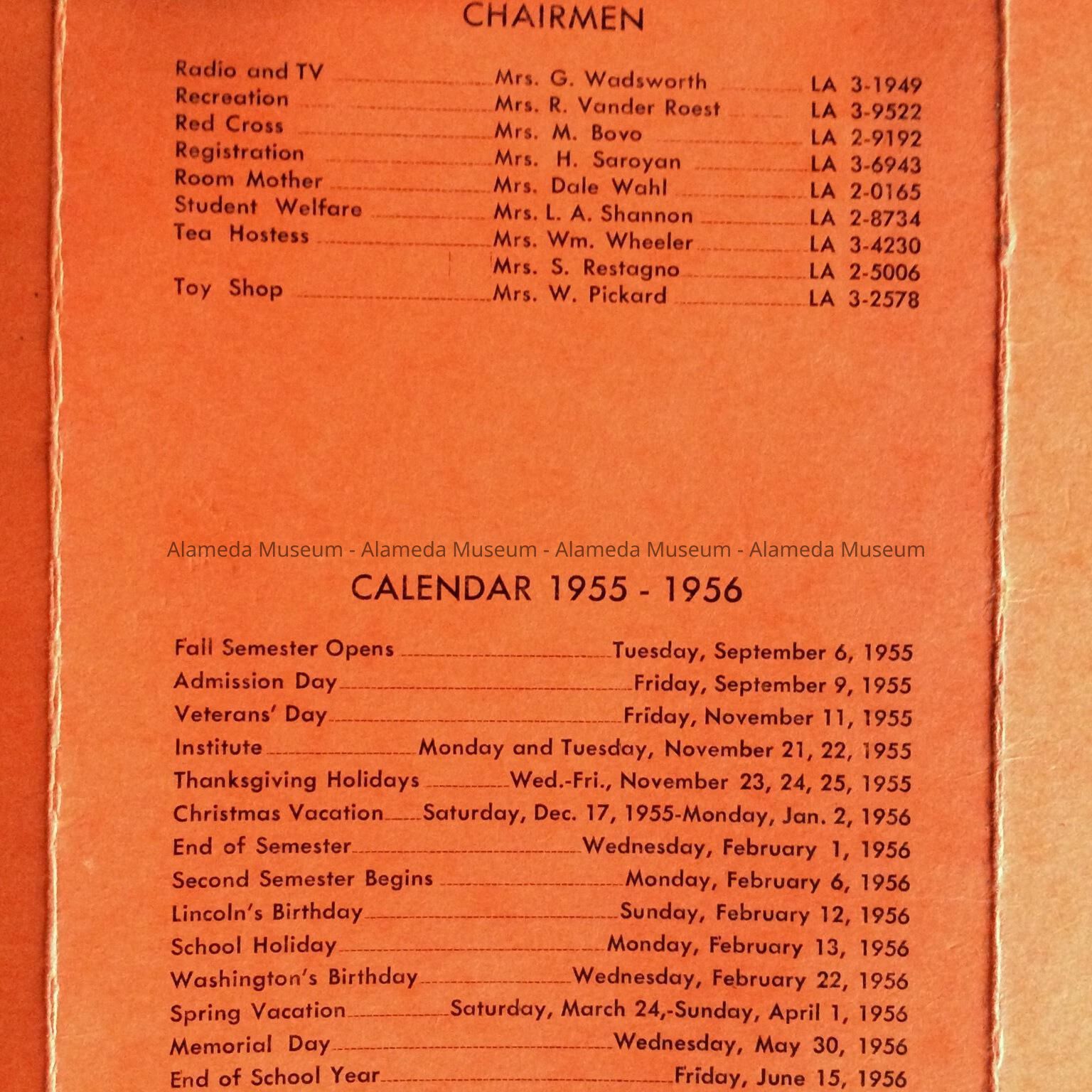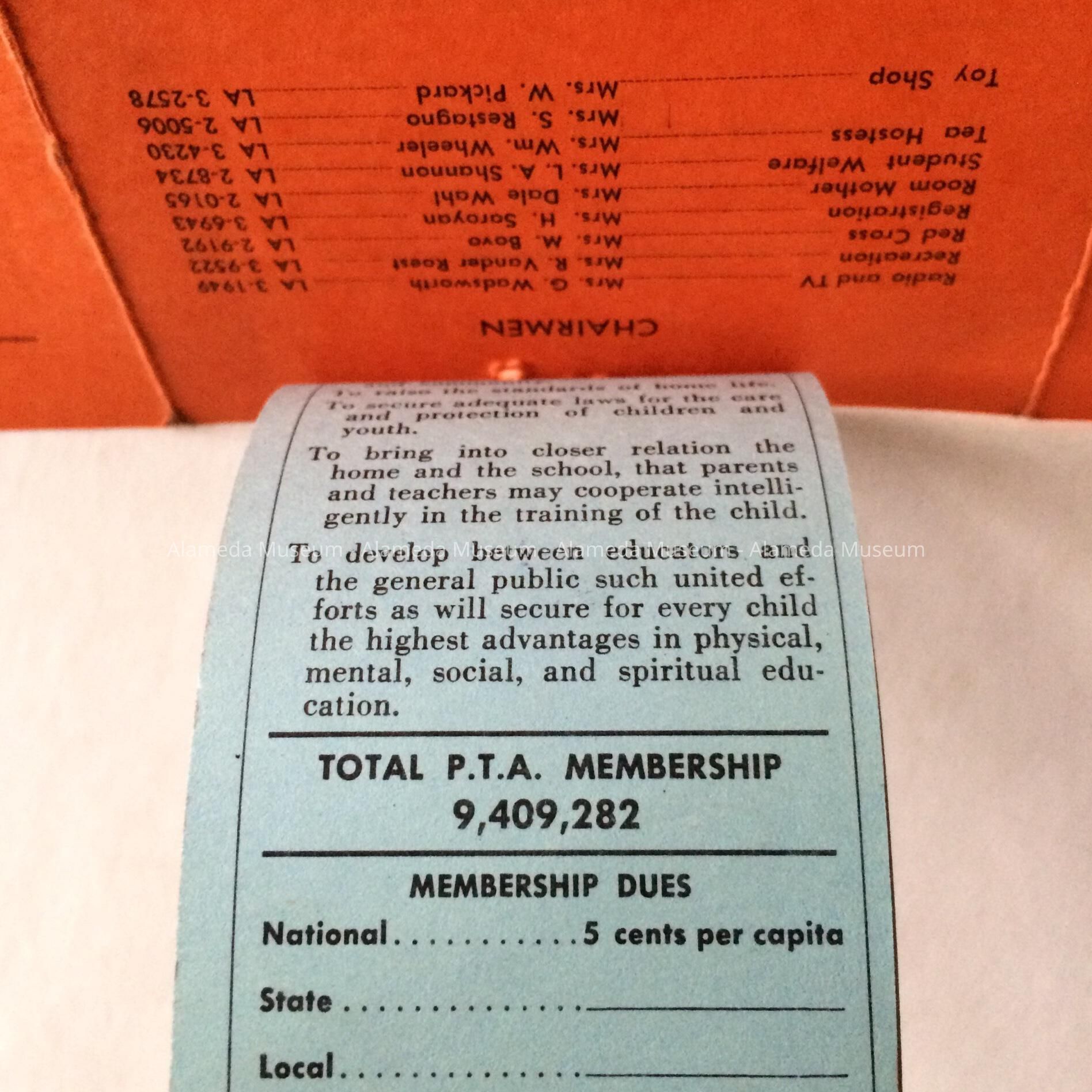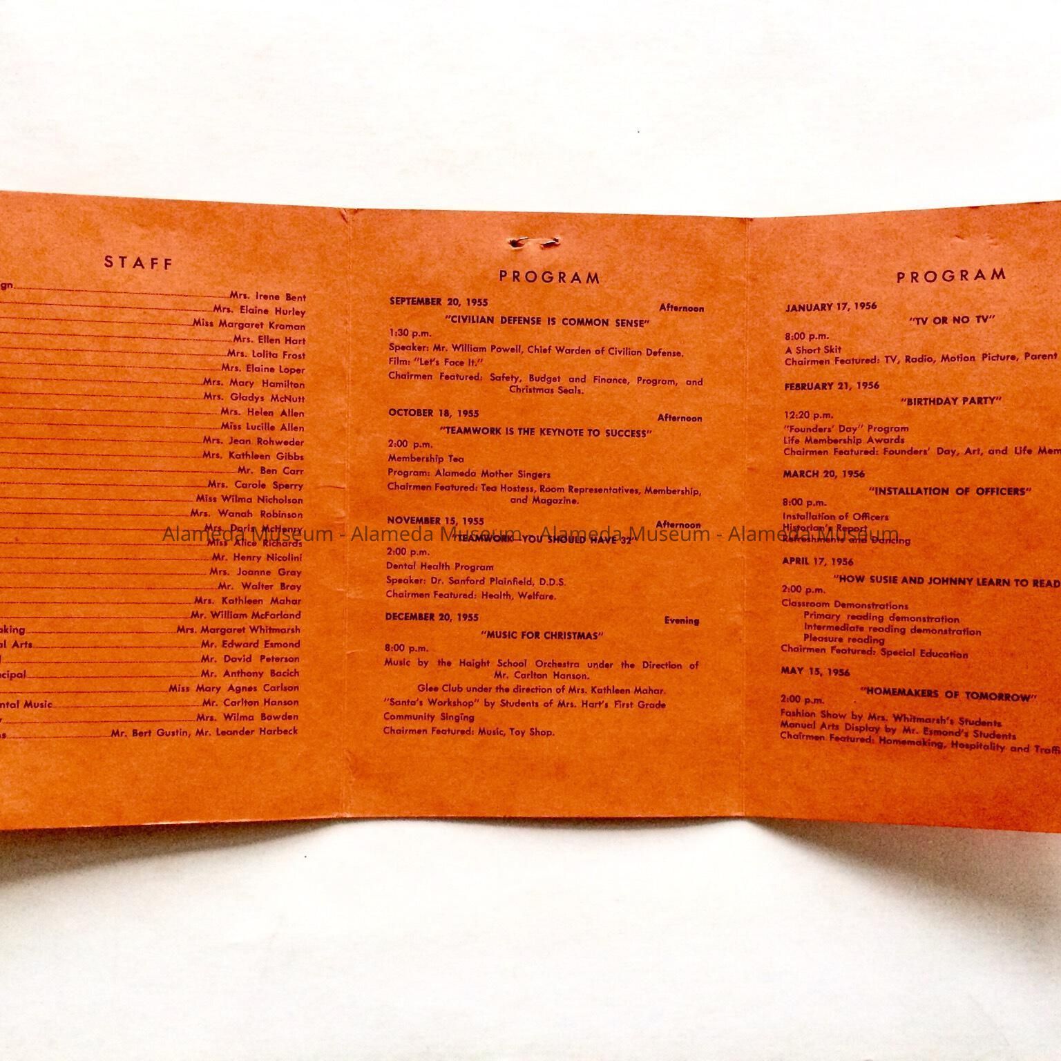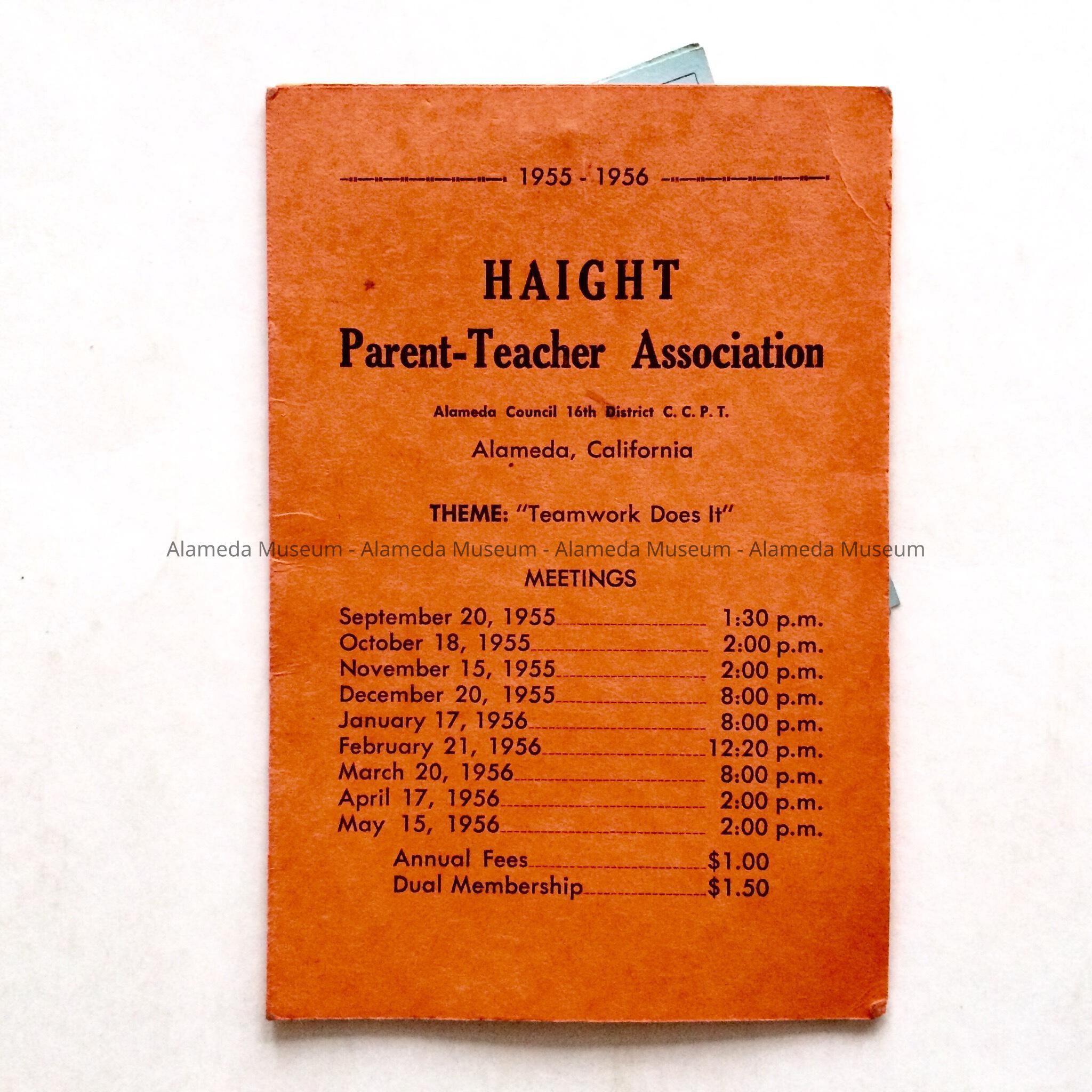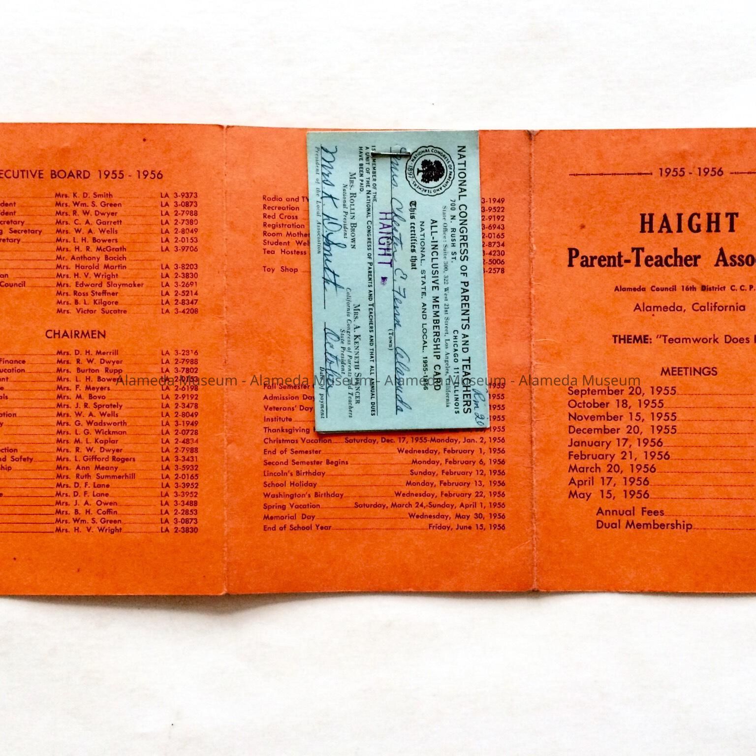History of Object: Flier containing information about meetings on various subjects presented by the Parent and Teacher Association of Haight School for the 1955-1956 school year. Lists names of Haight School staff and stapled to two membership cards to the National Congress of Parents and Teachers for Mr. and Mrs. Chester E. Fenn, of 2038 Alameda Avenue, for Haight School