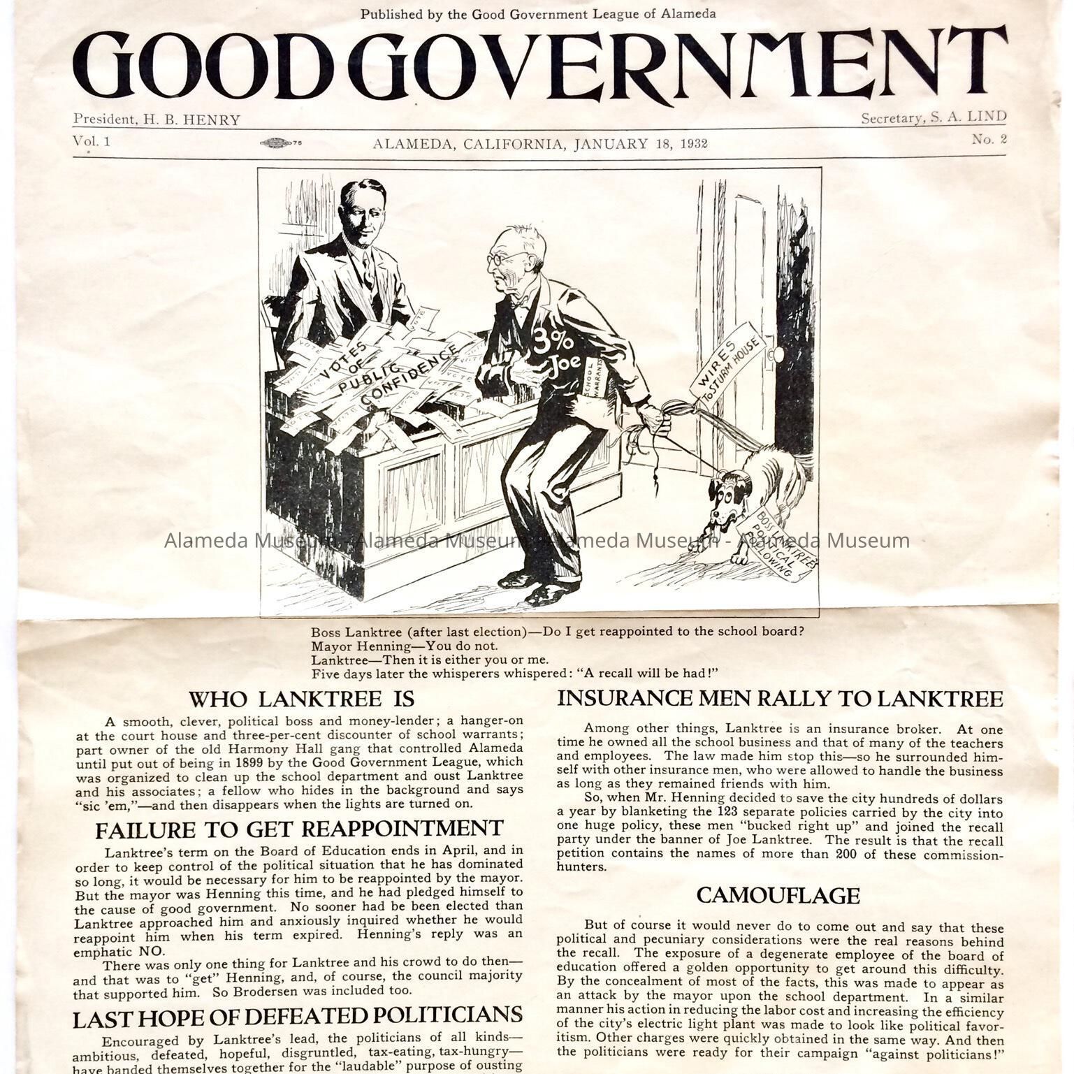 Description: Flyer or bulletin, printed on one side, bold heading "Good Government", and illustrated by political cartoon.