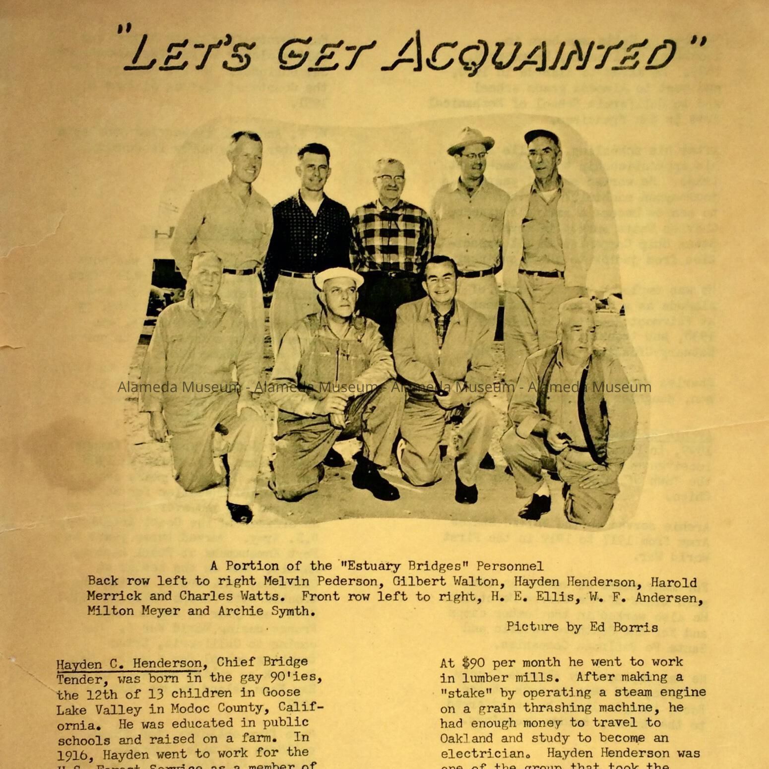 PUBLICATION ENTITLED "LET'S GET ACQUAINTED," WITH PHOTOGRAPHS OF BRIDGE EMPLOYEES, INCLUDING HAROLD MERRICK. THE PUBLICATION ALSO INCLUDES BIOGRAPHIES OF SOME OF THE EMPLOYEES.