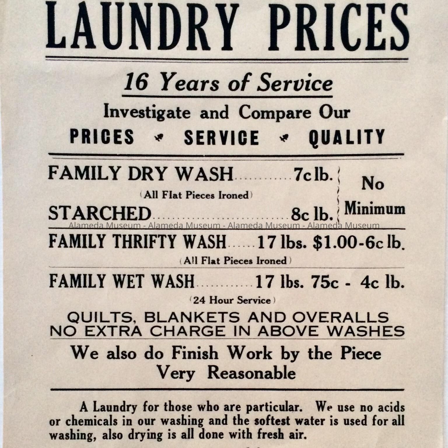 A FLIER LISTING LAUNDRY CHARGES FOR THE MODERN STEAM LAUNDRY, 1926 PARK STREET, ALAMEDA, CALIFORNIA; TELEPHONE AL 3012.