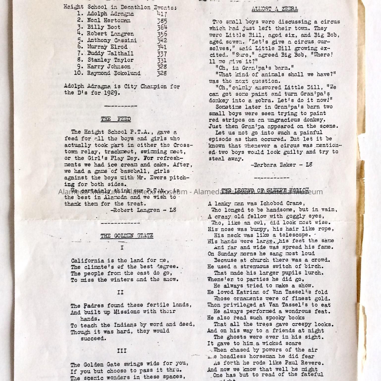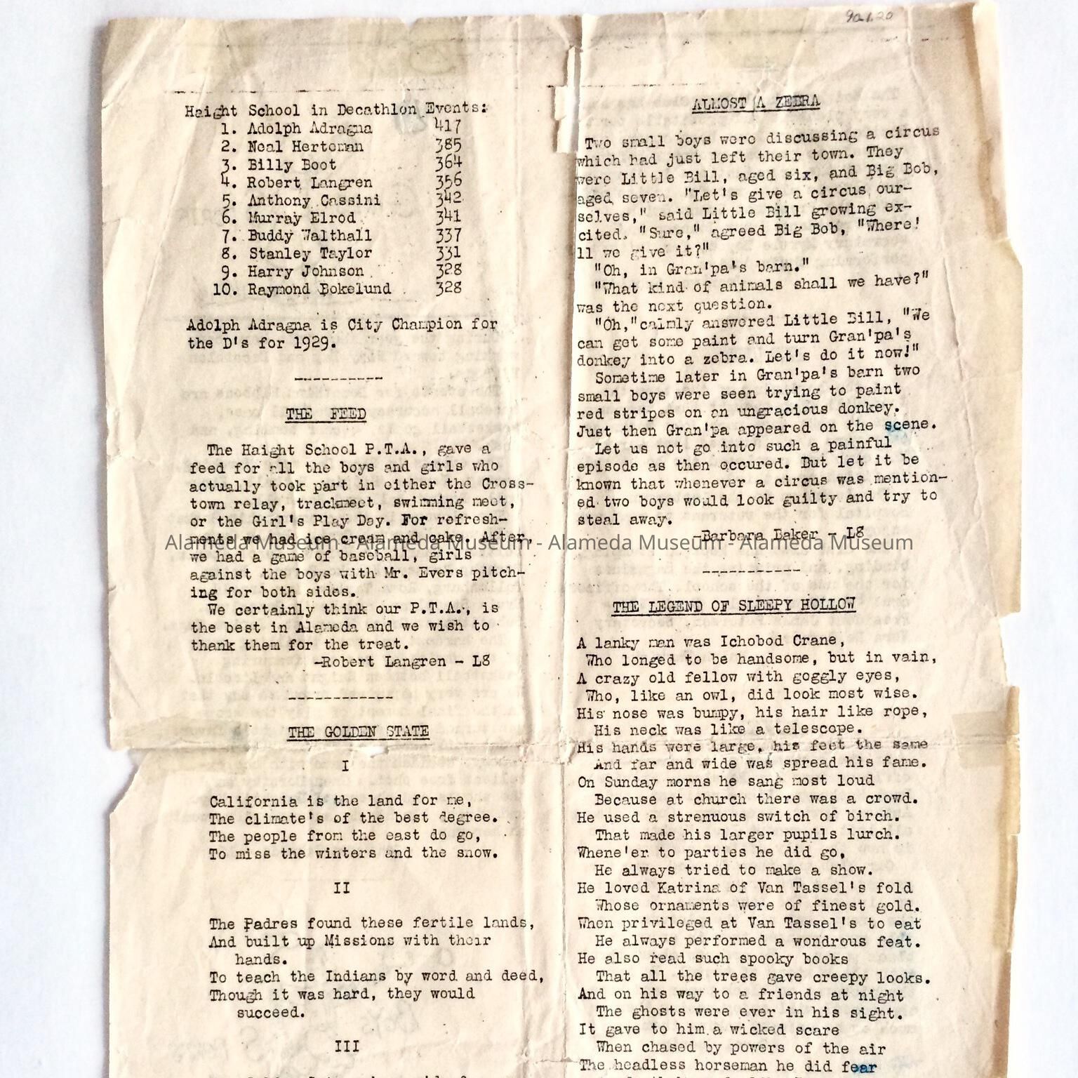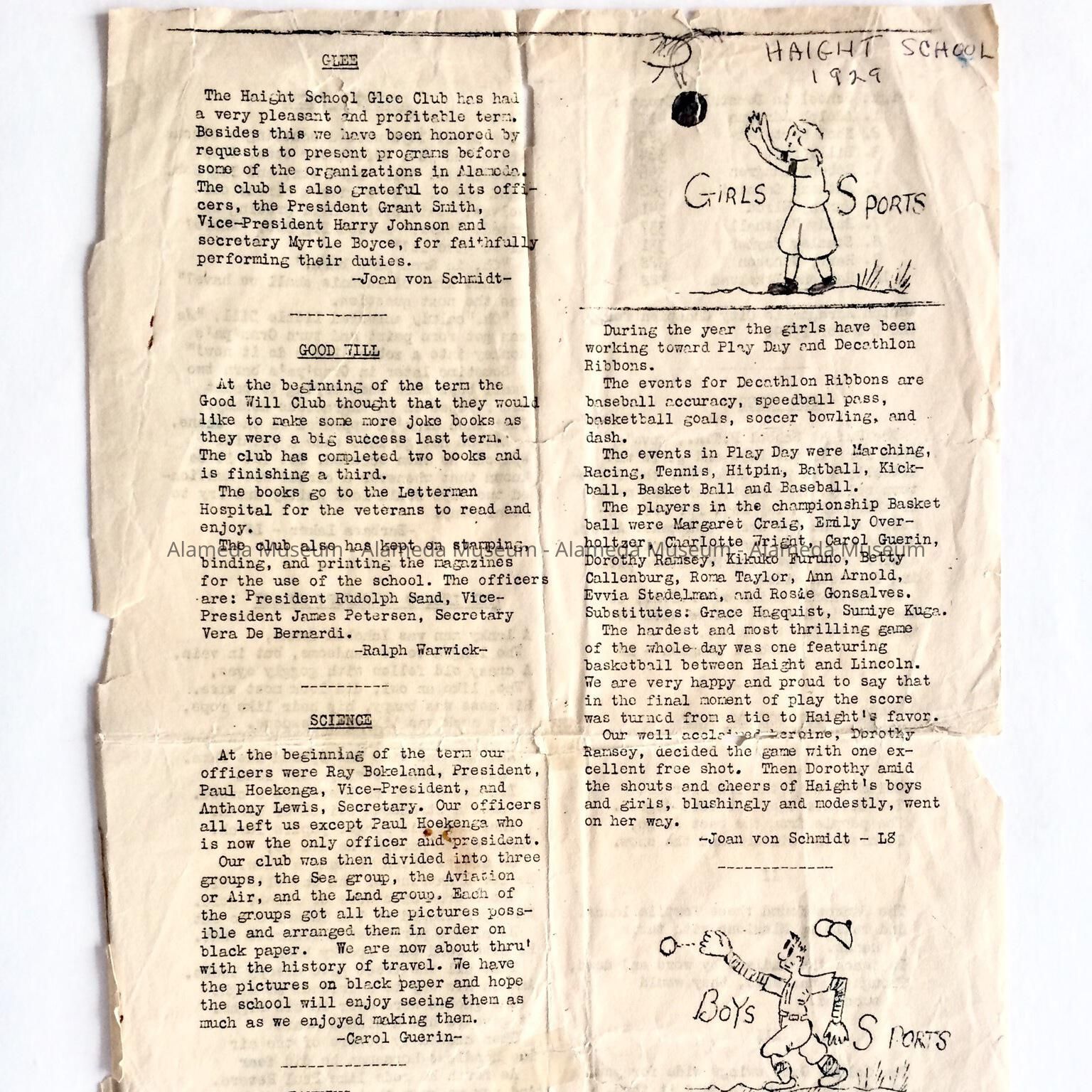 Haight School student newspaper or flyer, 1929. The donor, Barbara Baker, attended Haight School and graduated in 1929.