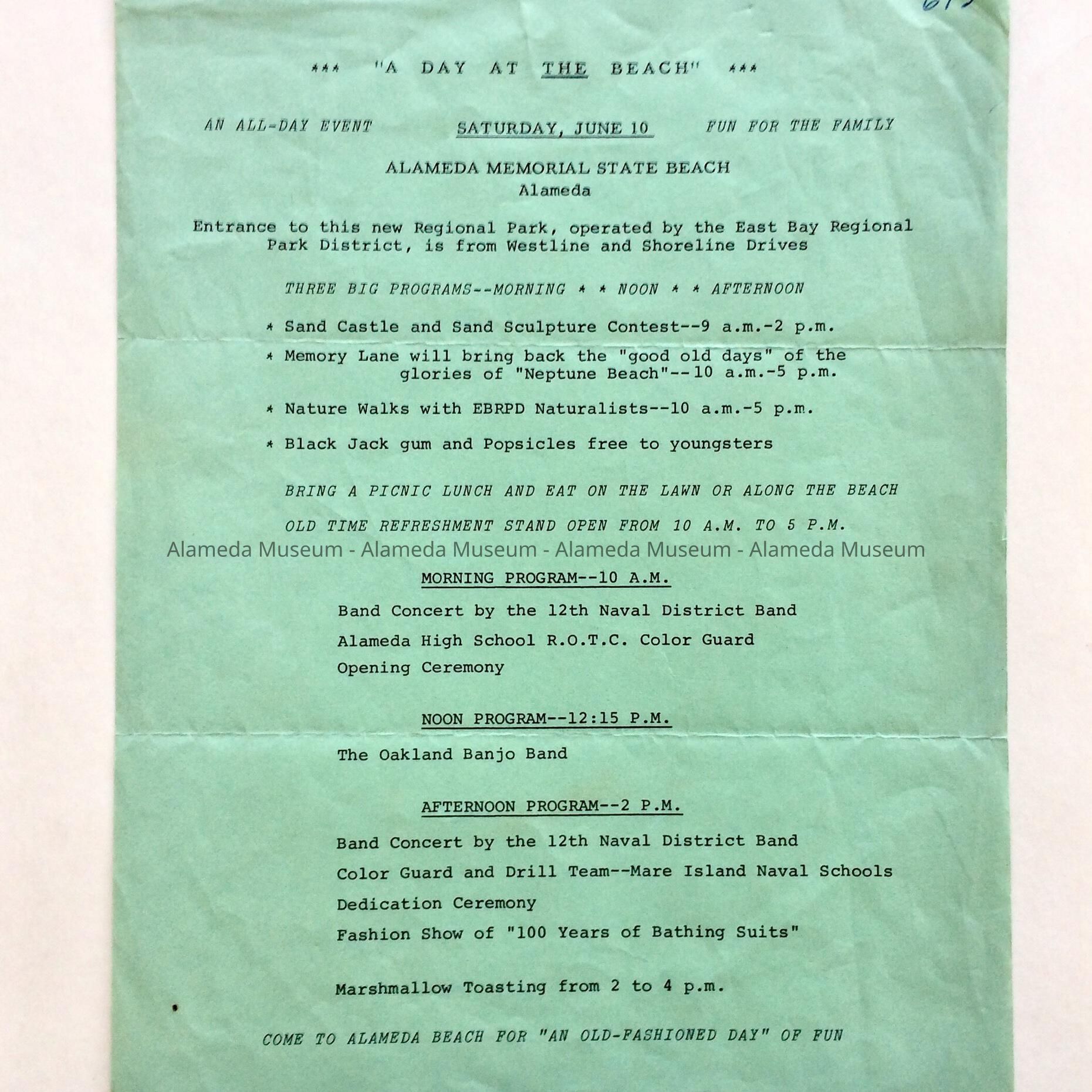 History: Flyer concerning events taking place at Alameda Memorial State Beach. The flyer states that it is the new regional park operated by the East Bay Municipal Utility District.