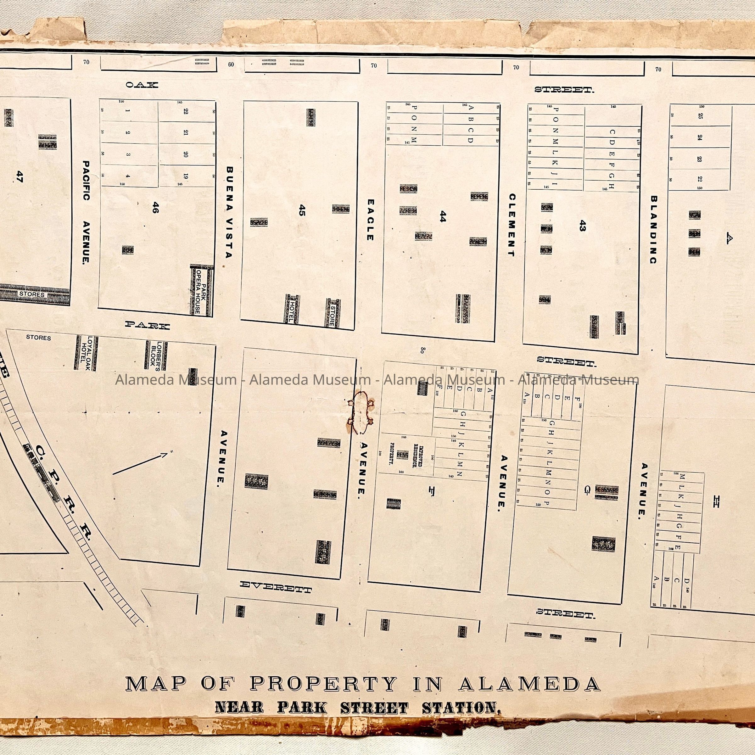 History: Flyer in the form of a map depicting individual lots for sale in the area bounded by Oak and Everett Streets, Blanding and Railroad Avenues. The map also indicates improvements such as the Park Opera House, etc.