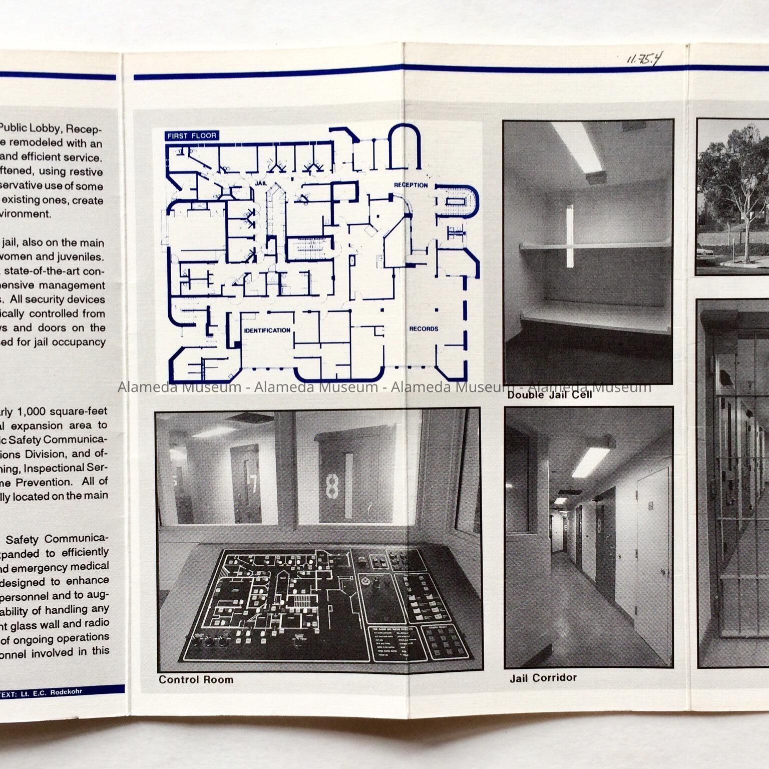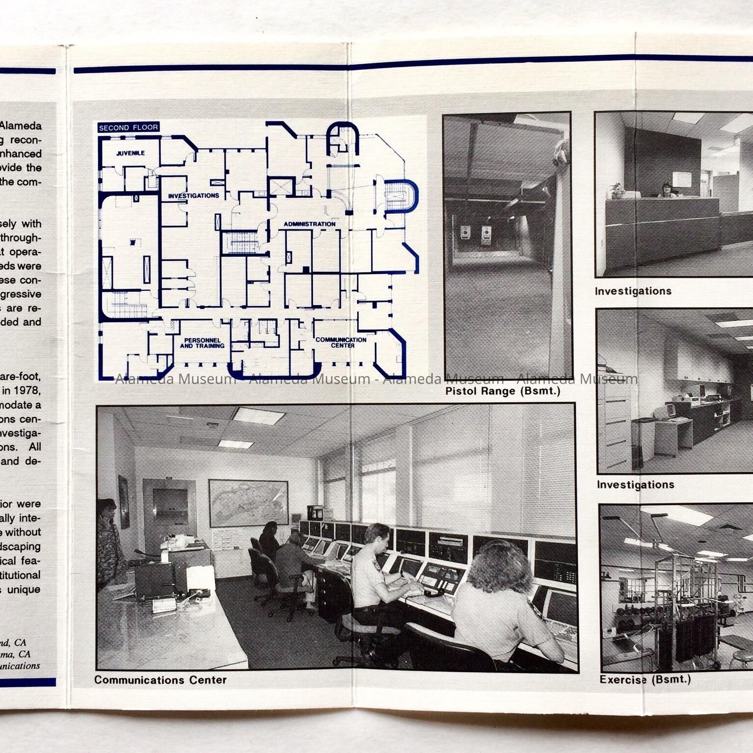 HISTORY OF OBJECT: AN ILLUSTRATED FLIER PRESENTING THE FLOOR PLAN AND PHOTOS OF THE INTERIOR OF THE ALAMEDA POLICE DEPARTMENT ADMINISTRATION BUILDING AT OAK STREET AND LINCOLN AVENUE.
