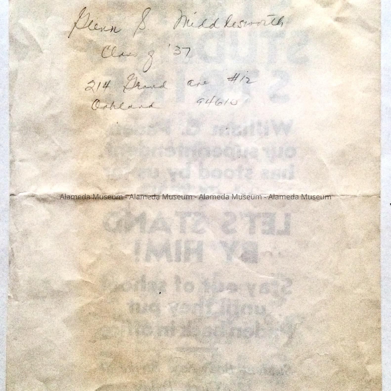 History: Flyer passed out to the student body of Alameda High School in support of Superintendent William G. Paden. The students were asked to stay out of school as a protest to the possible firing of Paden.